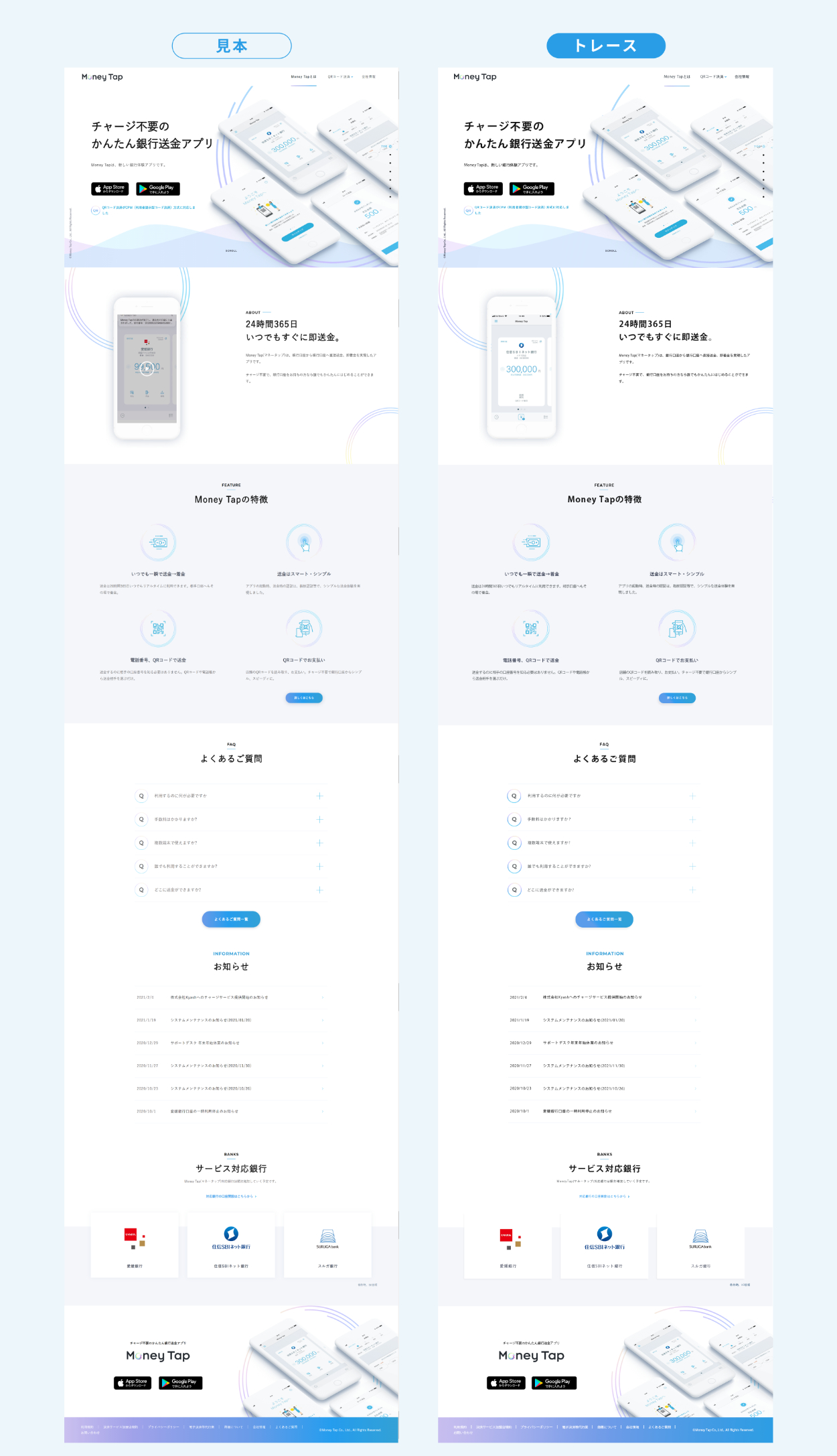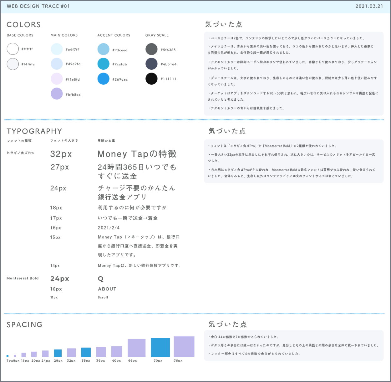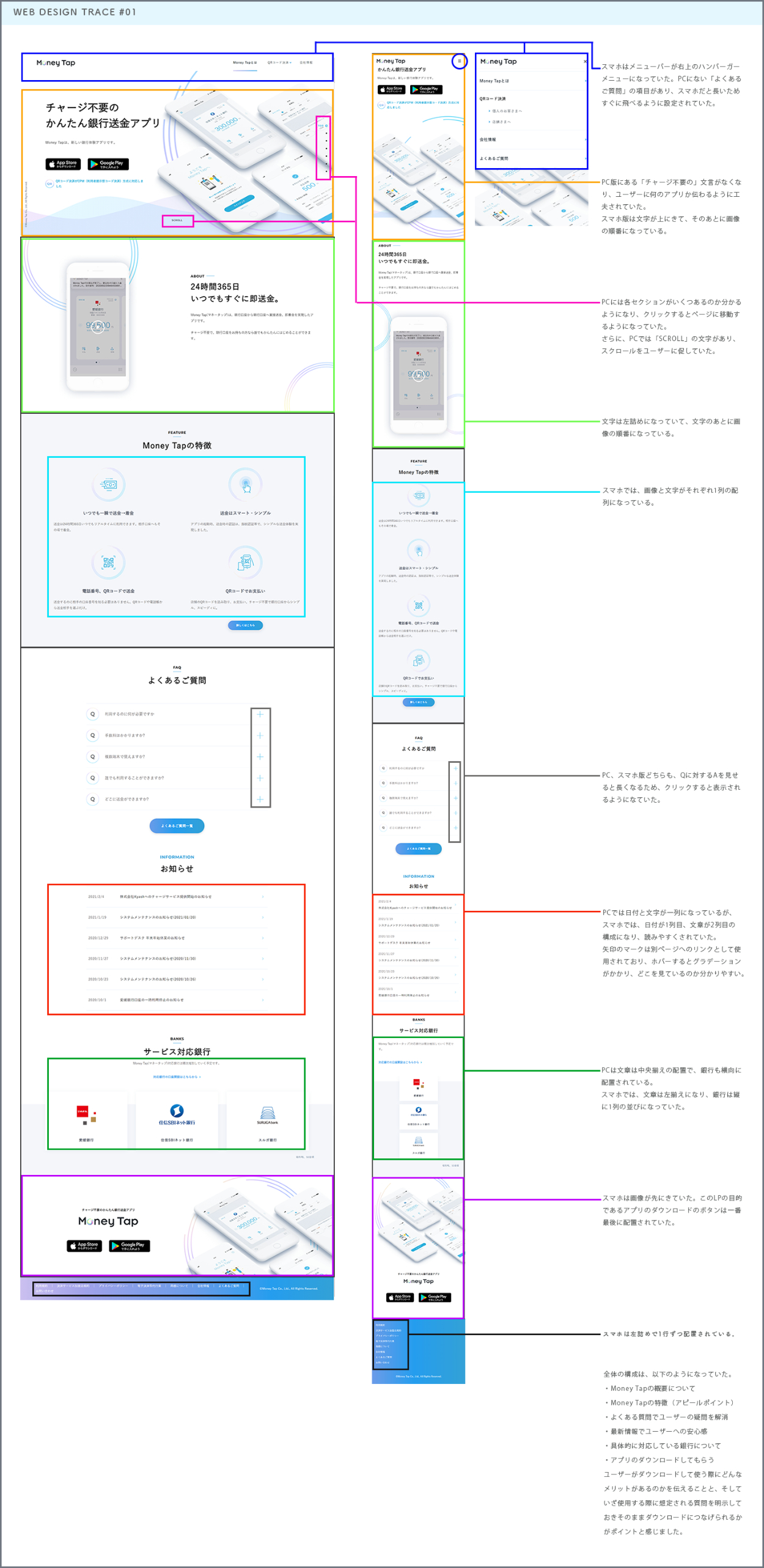 マルチクリエイターコースでの課題でWebページのトレースとスタイルガイドの作成、PC/SPのデバイスによるレイアウトの変化をまとめました。 引用元:https://moneytap.jp/