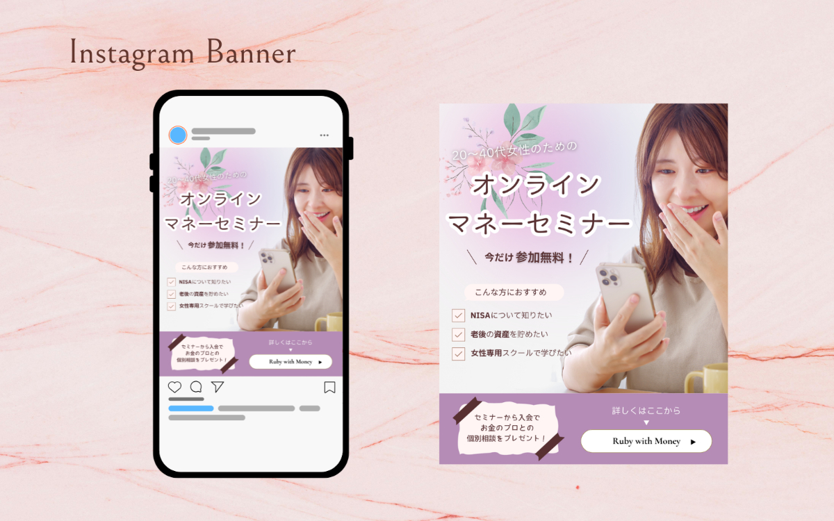将来の資産形成に興味がある女性に向けて、オンラインマネーセミナーの認知拡大と参加者募集を目的としたInstagram広告バナーを制作しました。