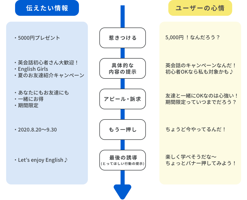 ・視線が止まる 左上 と 右下 に同じパターンの青バッジを置くことで、「英会話初心者さん大歓迎!」で呼びかけ→「Let's enjoy English♪」で行動意欲を掻き立てたい。