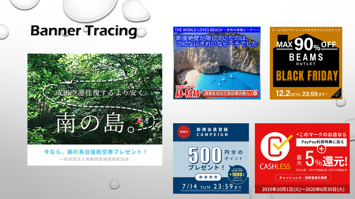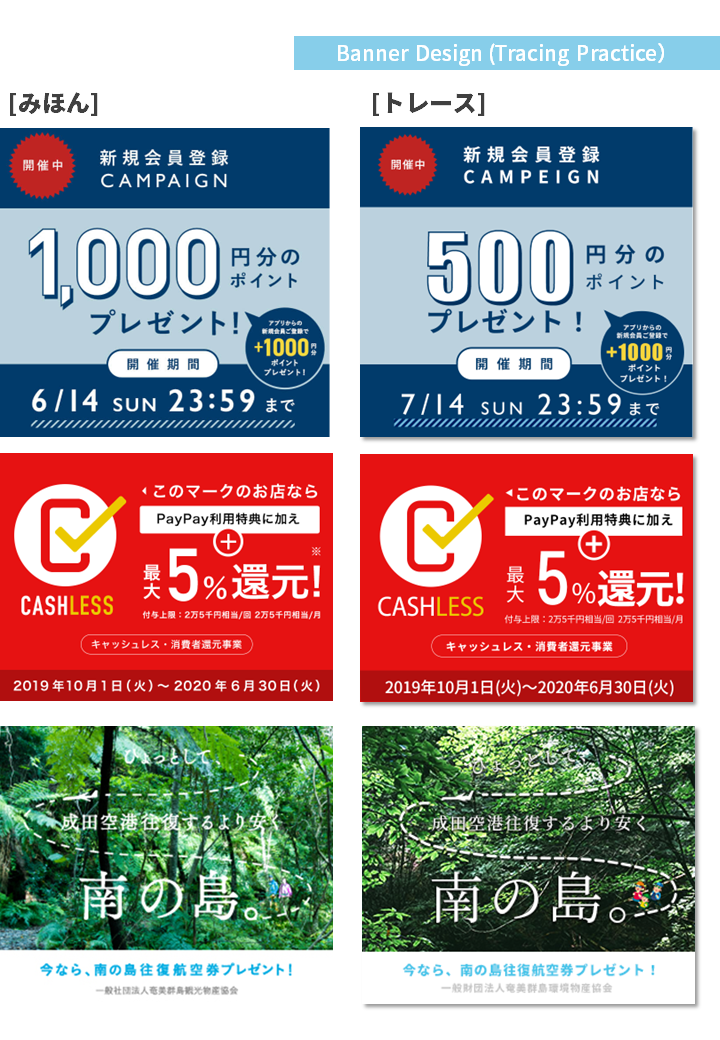【バナートレース】 まゆ OVERVIEW 授業課題および自主制作として、バナートレースを行いました。 ■トレースにあたって配色は文字のジャンプ率、レイアウトの再現を意識して製作しています。■使用ソフト:Photoshop■使用ソフト:illustratorバナー参考サイト:Banner Matome 様