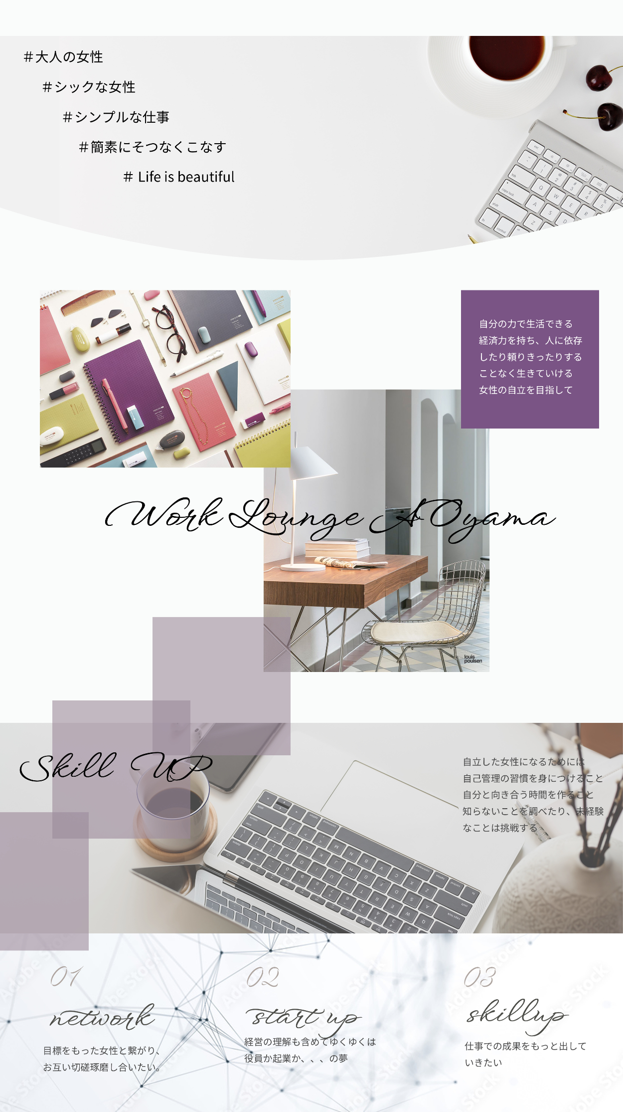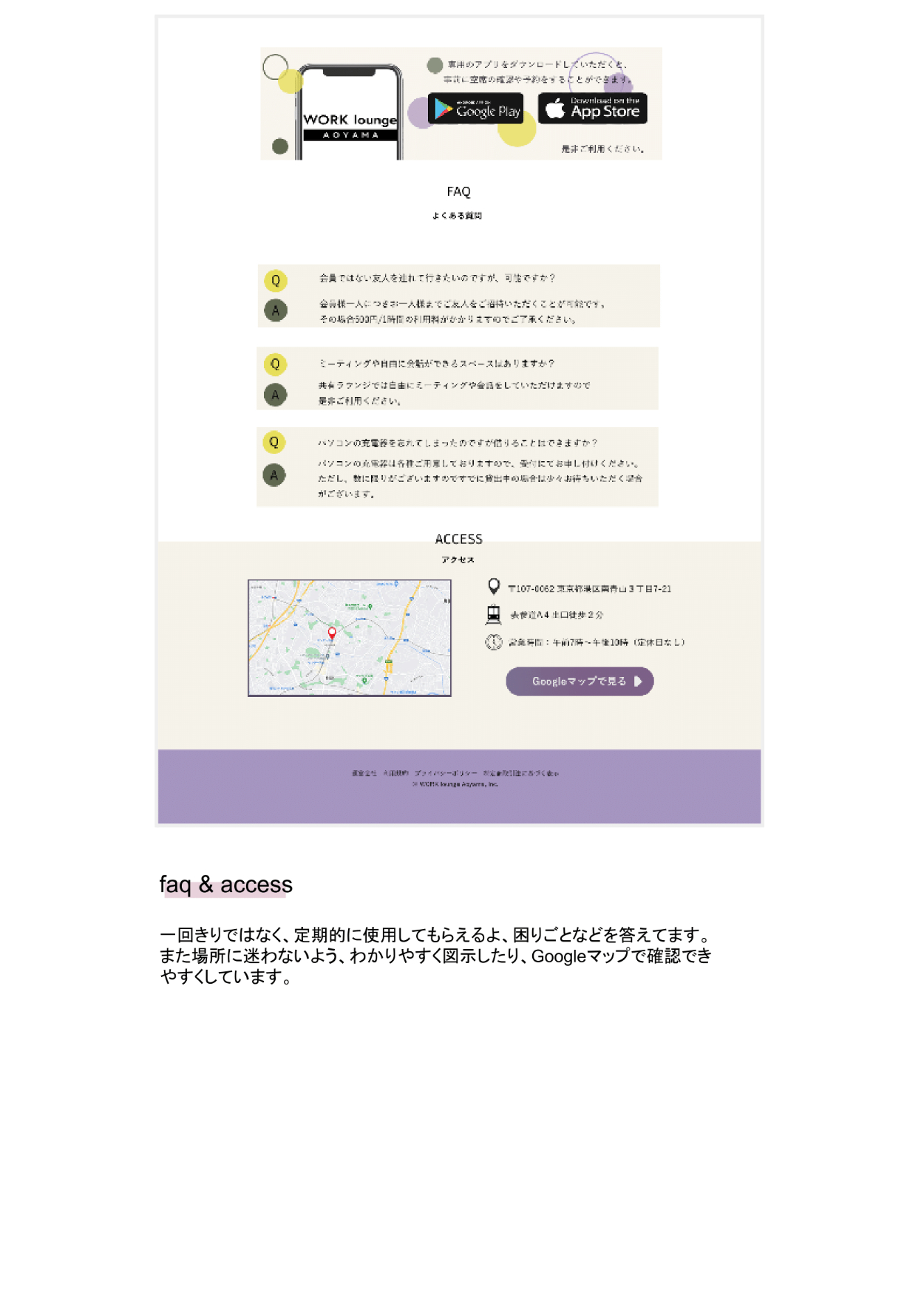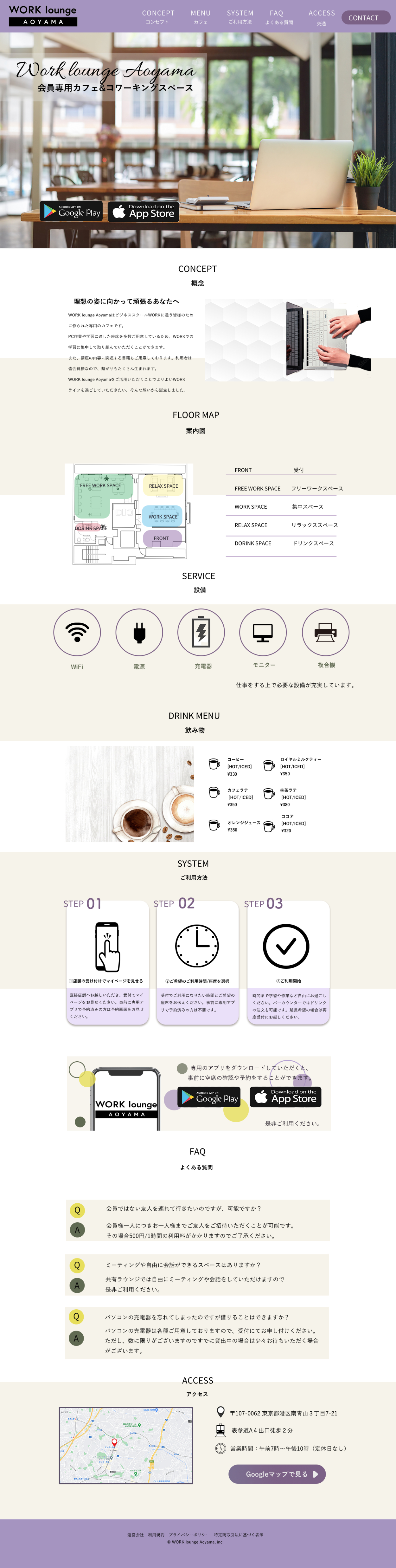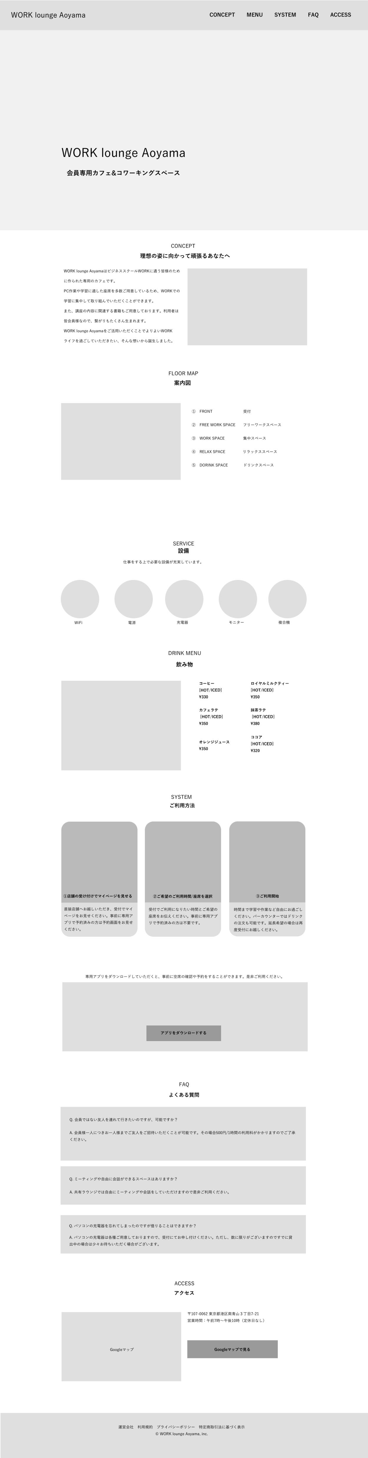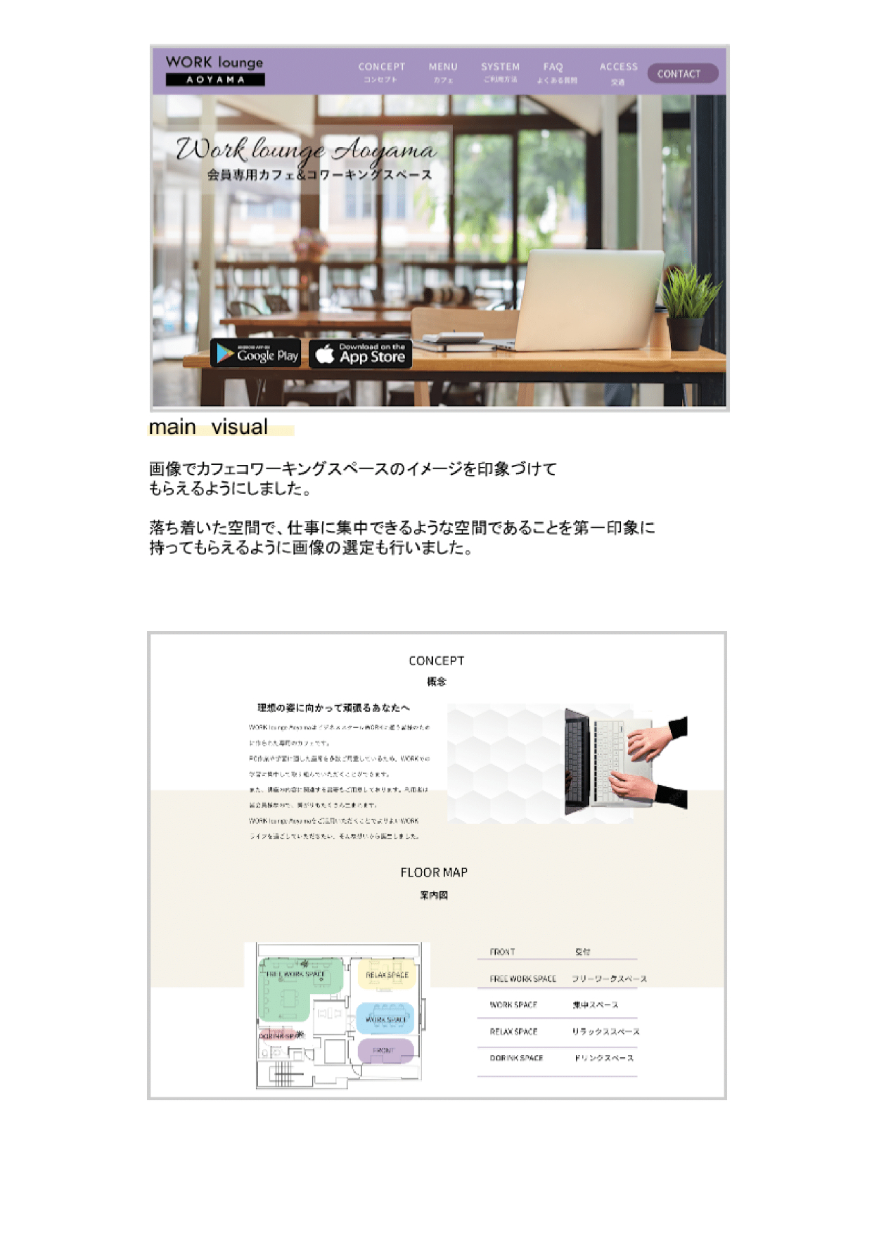 OVERVIEW "WORK lounge Aoyama"という架空の会員制のカフェ&コワーキングスペースの LPデザインを行いました。