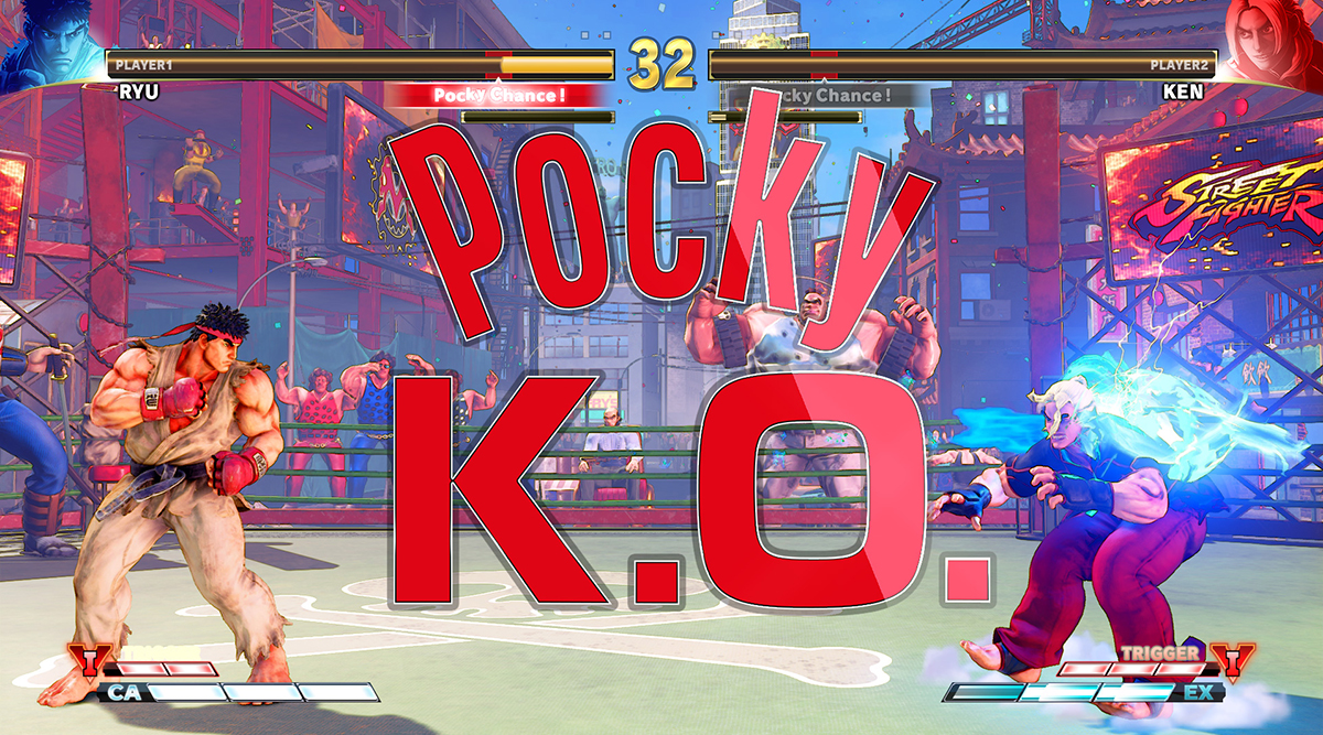 自身のキャラクターの体力ゲージをPockyのチョコとビスケットと同じ比率になるようコントロールし、その状態で相手を倒すという新しいストリートファイターVの楽しみ方「Pocky K.O.」というルールを作り出しました。
