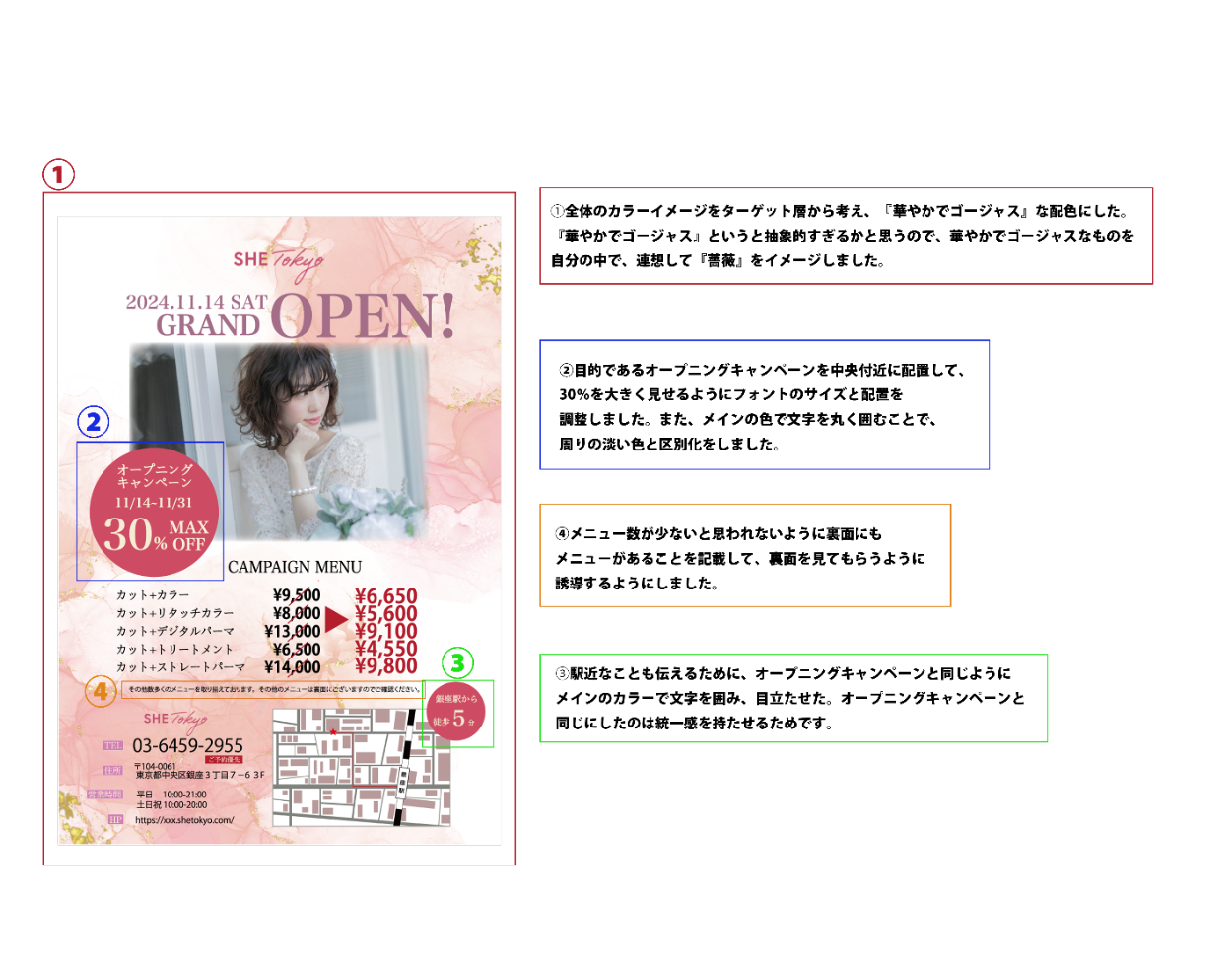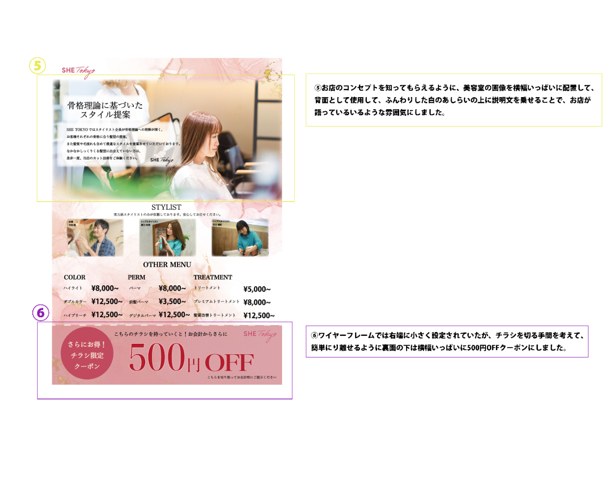 Webと異なり、紙のチラシは限られたスペースの中で「どこまで見てもらえるか」を常に意識しながら情報設計をする必要がありました。特に、フォントサイズの調整や視線誘導のための強調ポイントの工夫など、レイアウトに対する繊細な配慮が求められました。