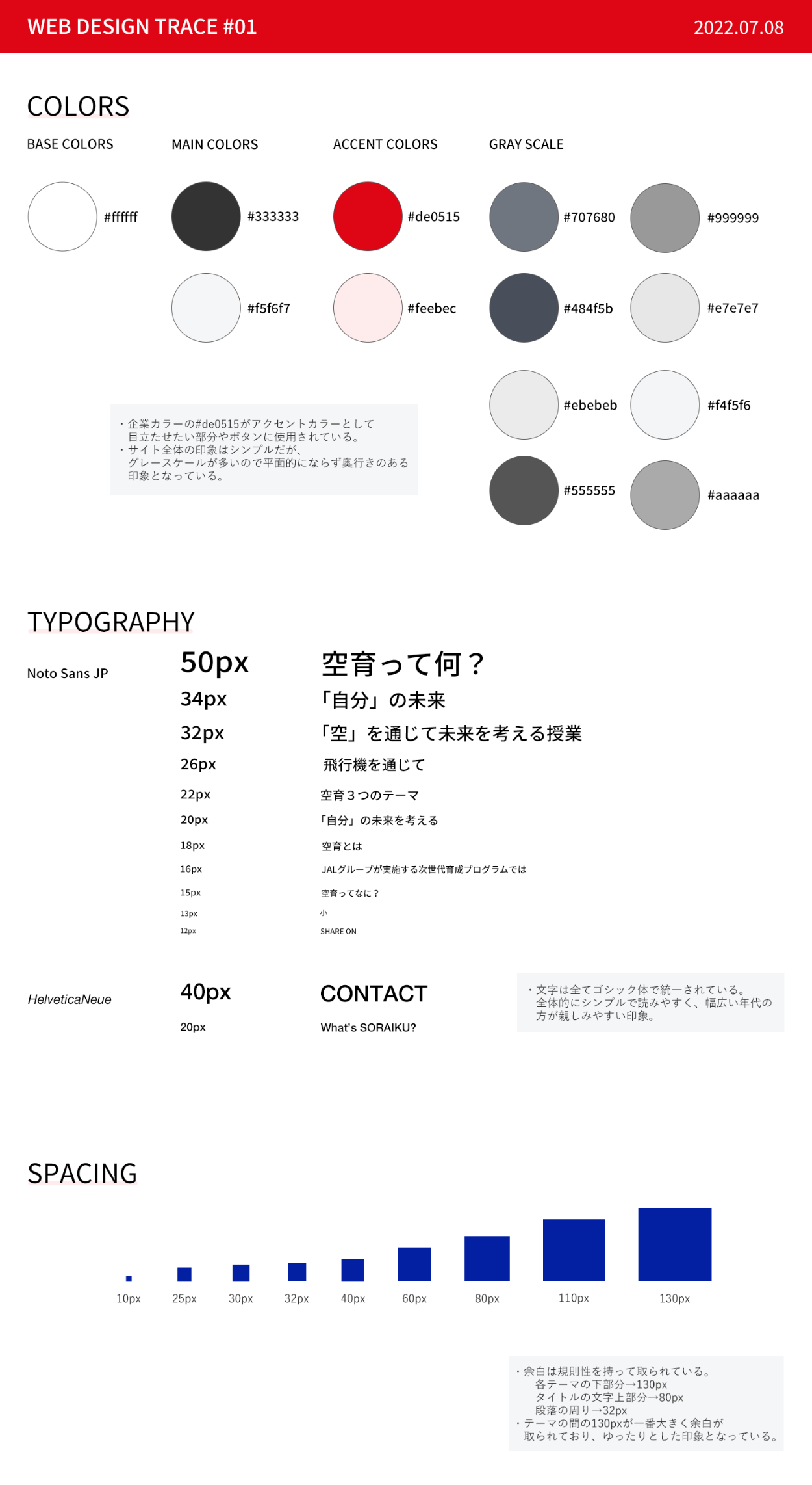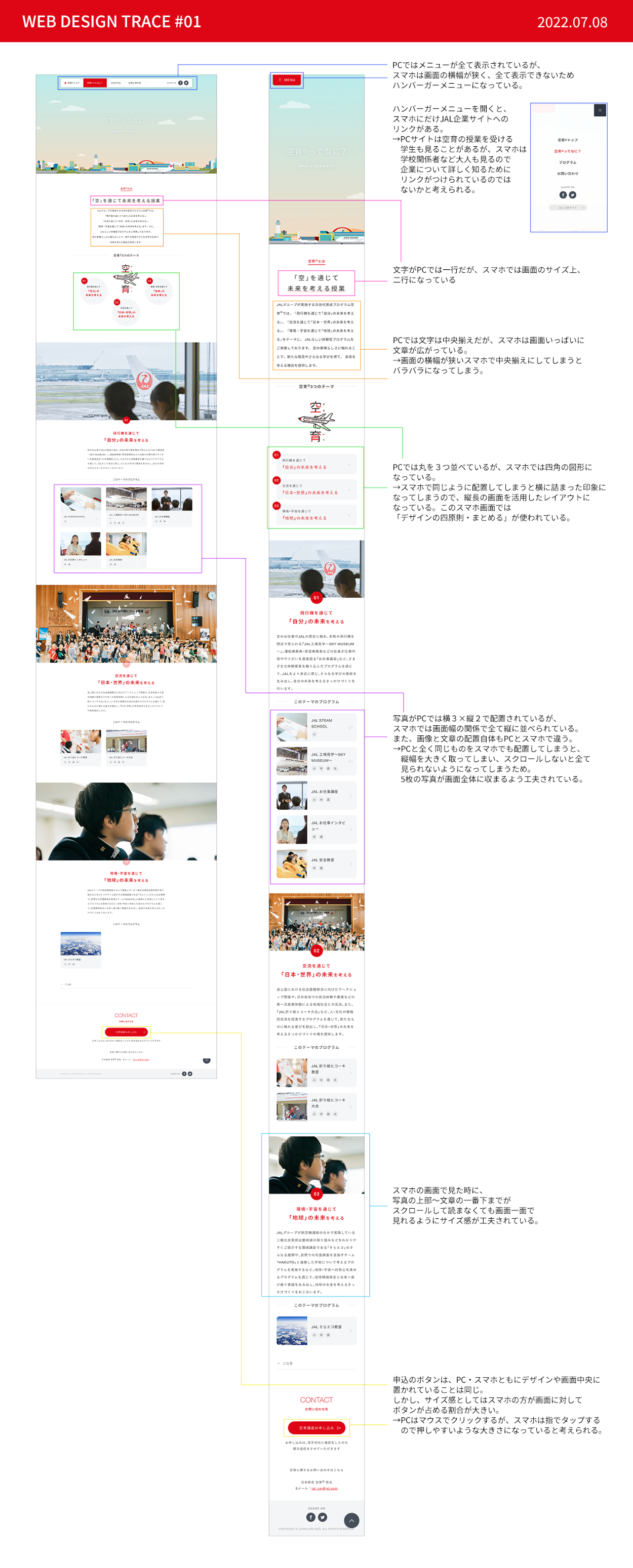 トレースだけでなく、スタイルガイドの作成やスマホとPCでのレイアウトの違いまで観察することで、より細かく色々な視点でWebサイトを見ることができました。