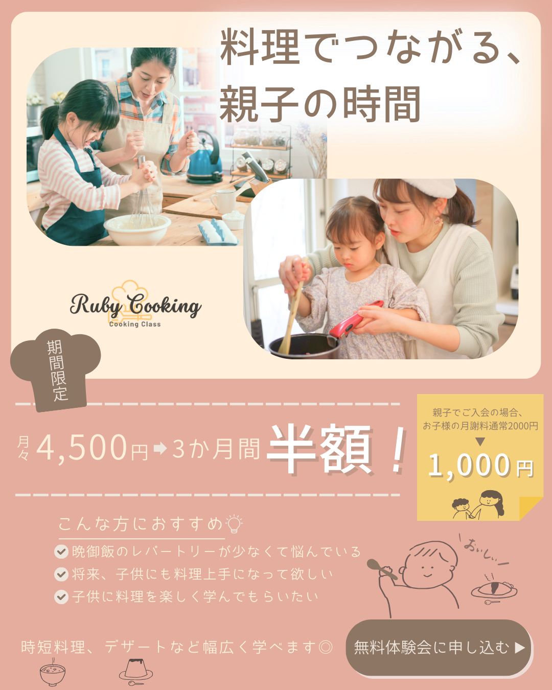 ・画像は支給画像から親子が自然体に料理を楽しんでいるものを選び、実際の受講をイメージしやすいものにしました。