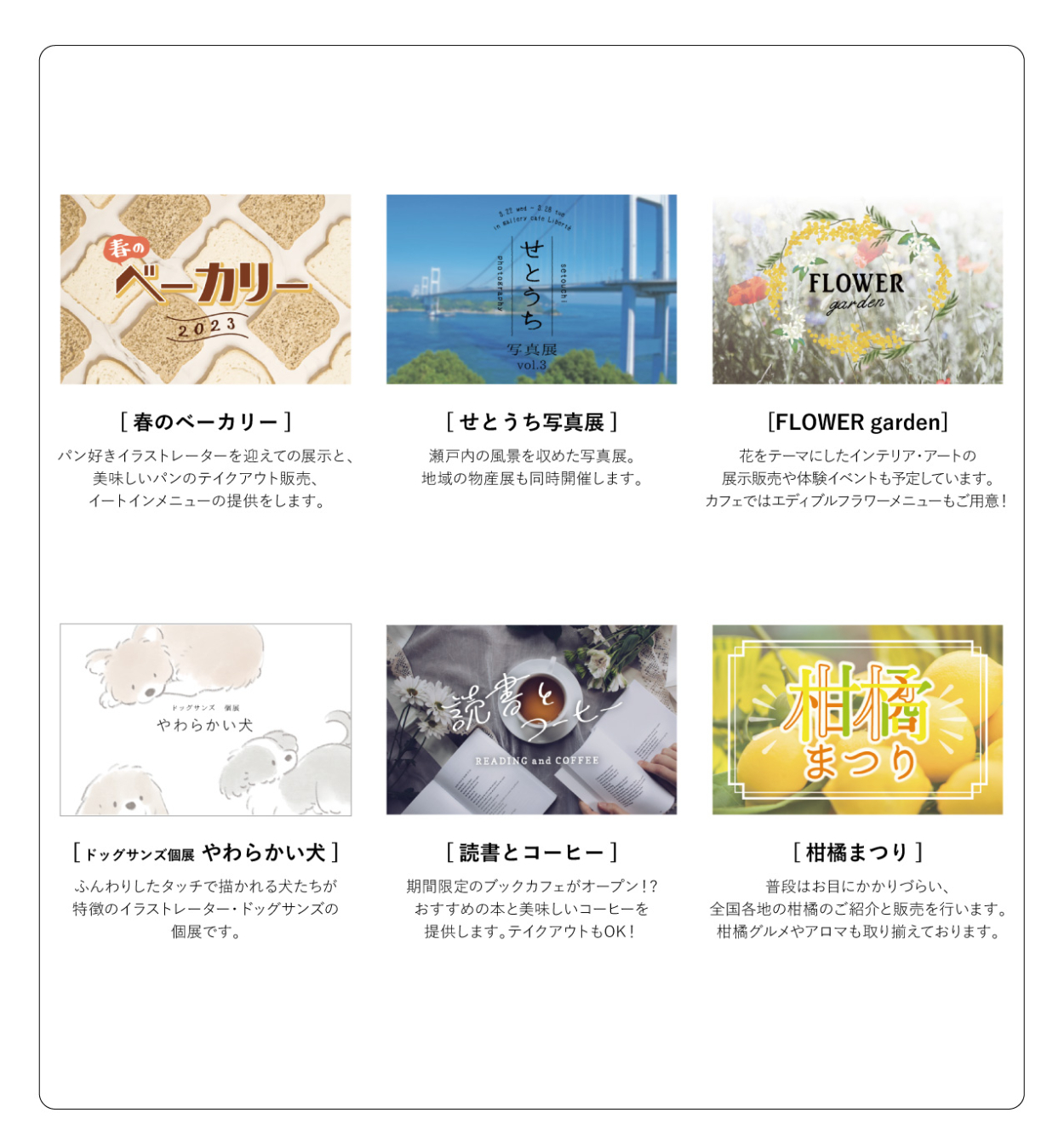 ギャラリーの特性である「ギャラリーとカフェ(飲食)」を生かしつつ、様々な企画に沿える場所であることをアピールするため、出来るだけ幅広いテーマやデザインテイストになるよう心がけました。