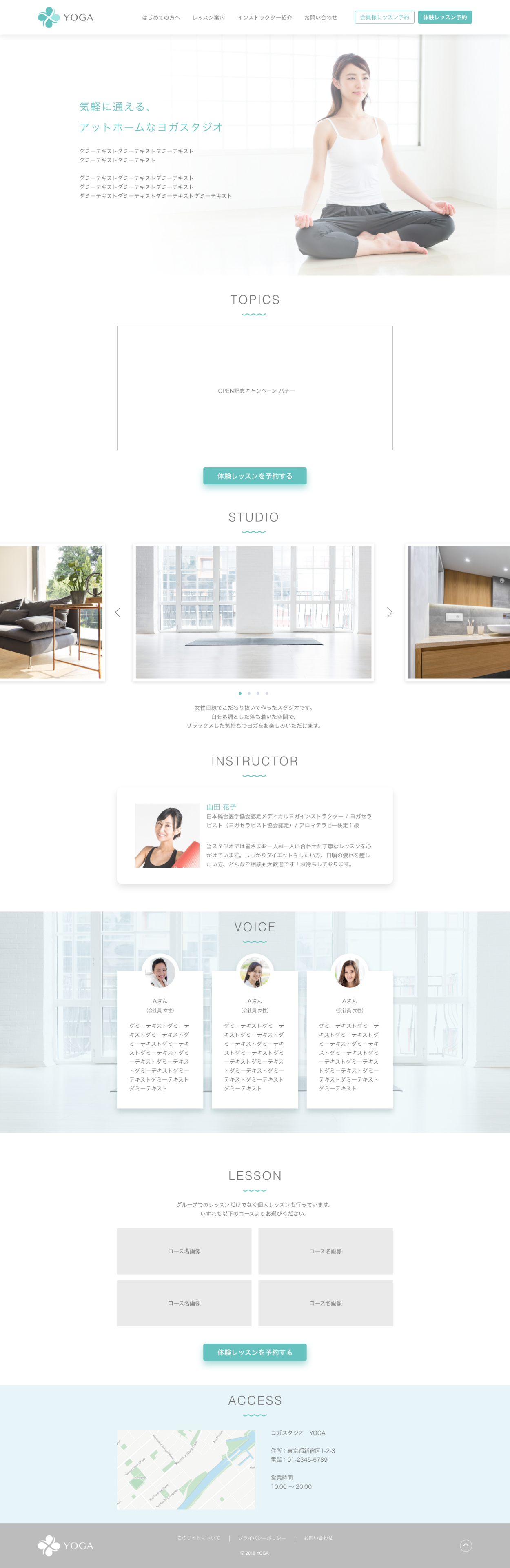 大手のジムで大人数を対象に教えていたが、もう少し一人一人の生徒さんと向き合って会話をしながらレッスン内容もその時々で変えていくようなアットホームなレッスンをしたいと思い、このヨガスタジオを立ち上げたばかり。集客に力を入れたい時期。大手と差別化できるようなサイトにしたい。