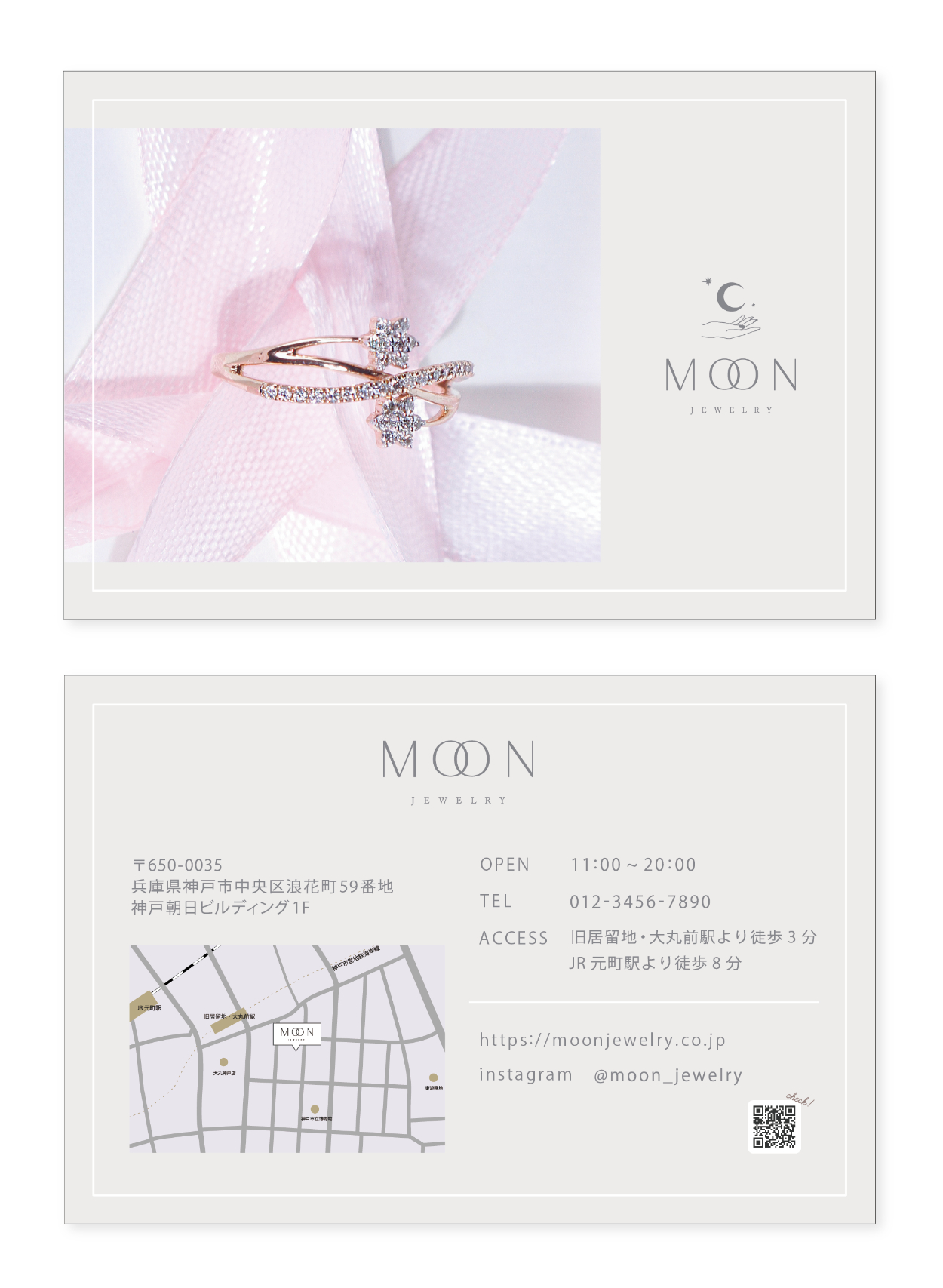 職業訓練校での最初の課題の2つ目に、架空ジュエリーブランド「Moon」様のショップカード制作をしました。ロゴ制作と同様のブランド、官製はがきサイズ両面で案内地図付きであること以外、内容はフリーで行いました。 【制作時間:約1週間】