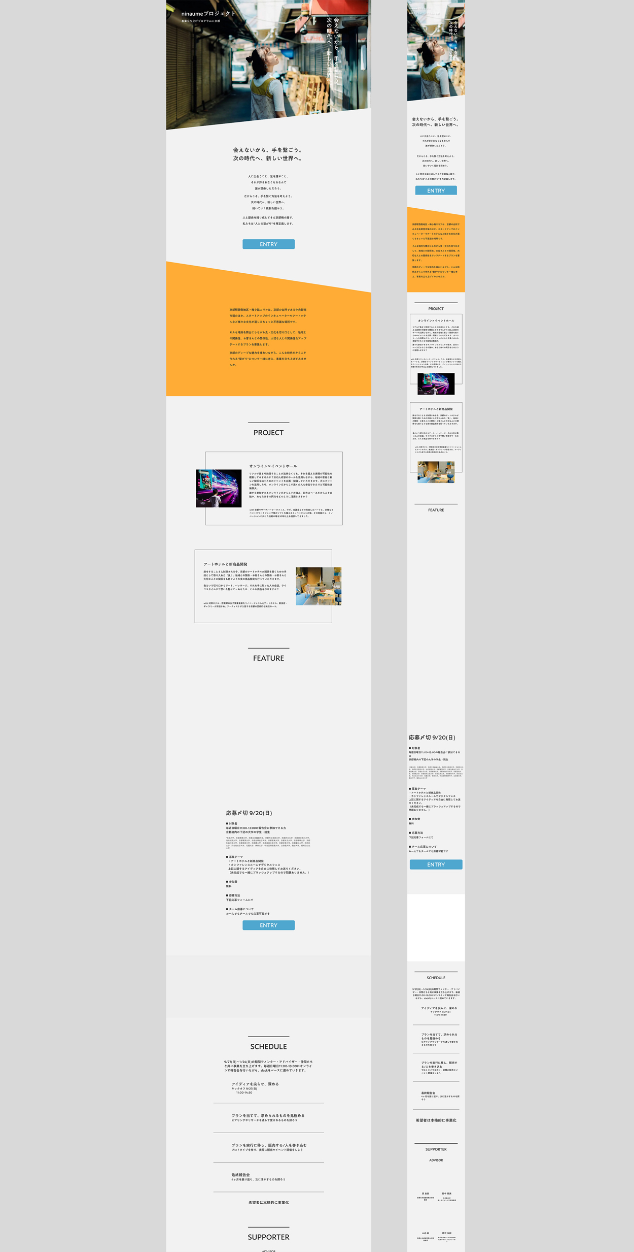 京都駅西側地区・梅小路エリアを学生の力で盛り上げるninaumeプロジェクトのLPを制作させて頂きました。起業、イベント運営に興味のある学生が対象です。クライアントから「いかついイメージを払拭したい」というご要望があったので色合いをポップにし、身近に感じてもらえるよう工夫しました。