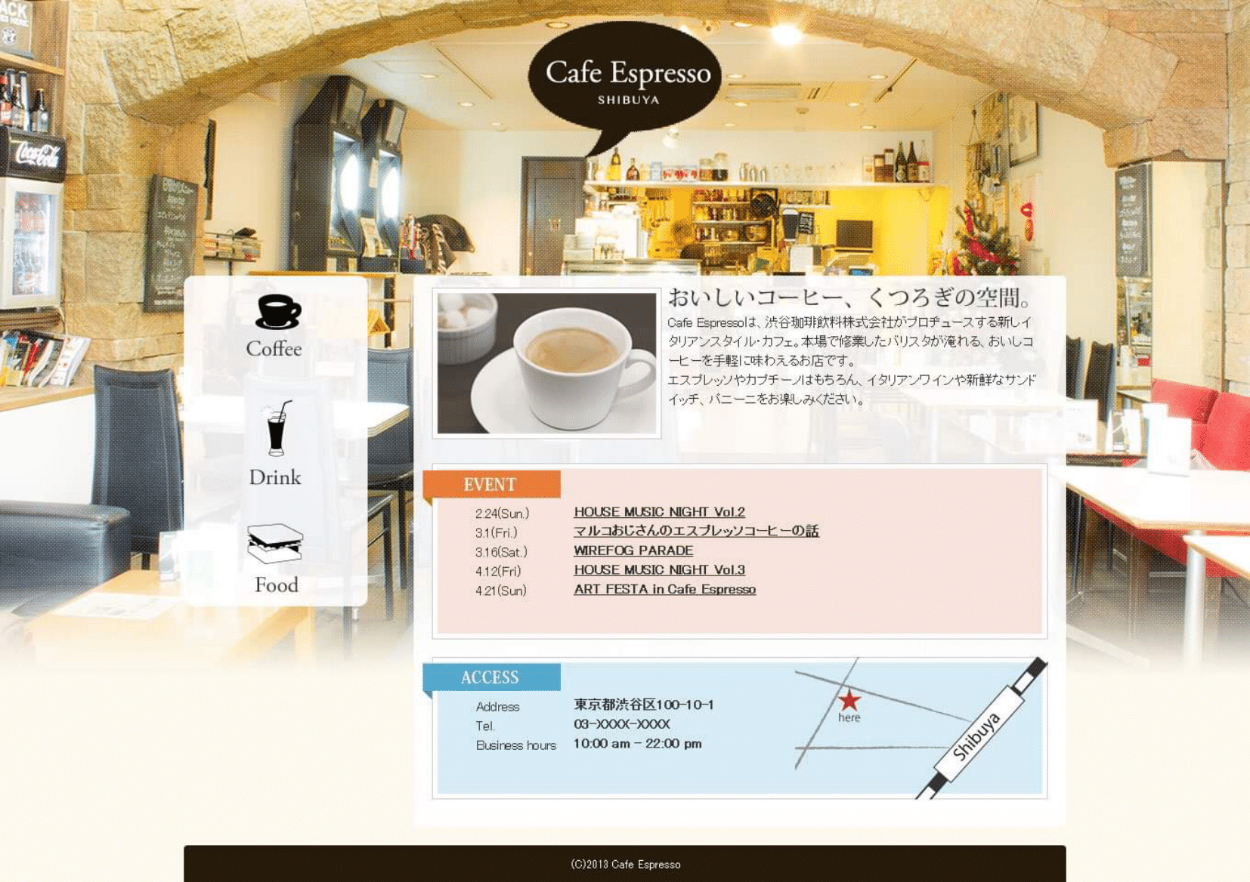 カフェのサイトなので、シックな雰囲気を出すために色合いを茶色テイストにし、ゆったりできる雰囲気に仕上げました。