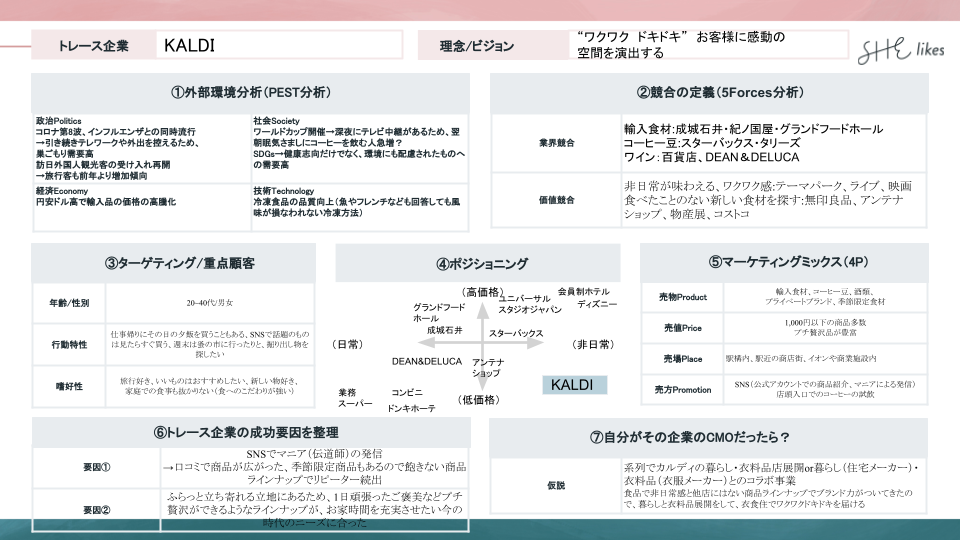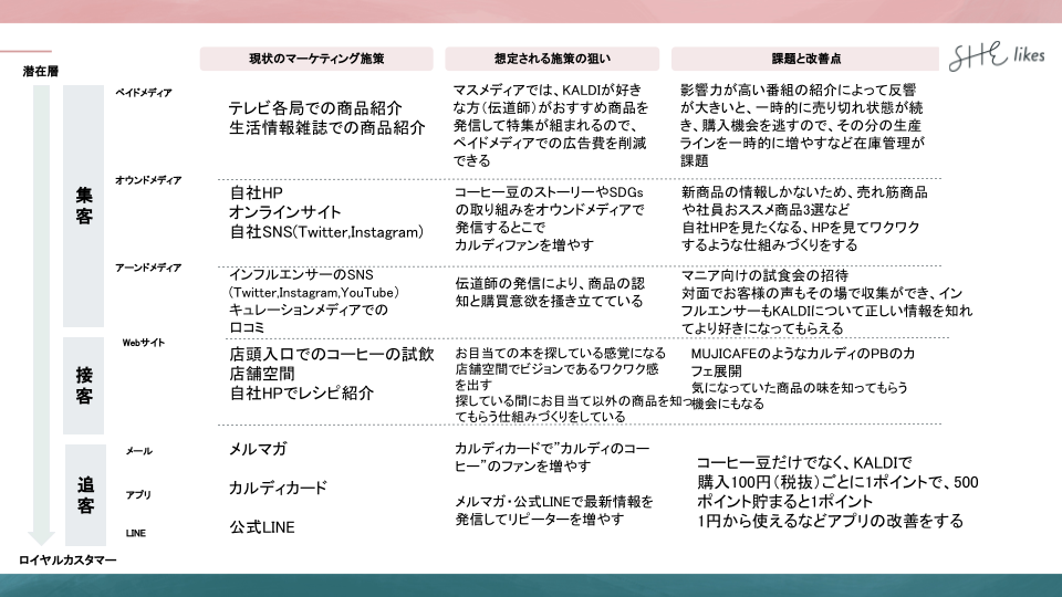 今回は、キャリアスクール「SHElikes」のWebマーケティングコース卒業制作として、カルディコーヒーファームのマーケティングトレースを行いました。