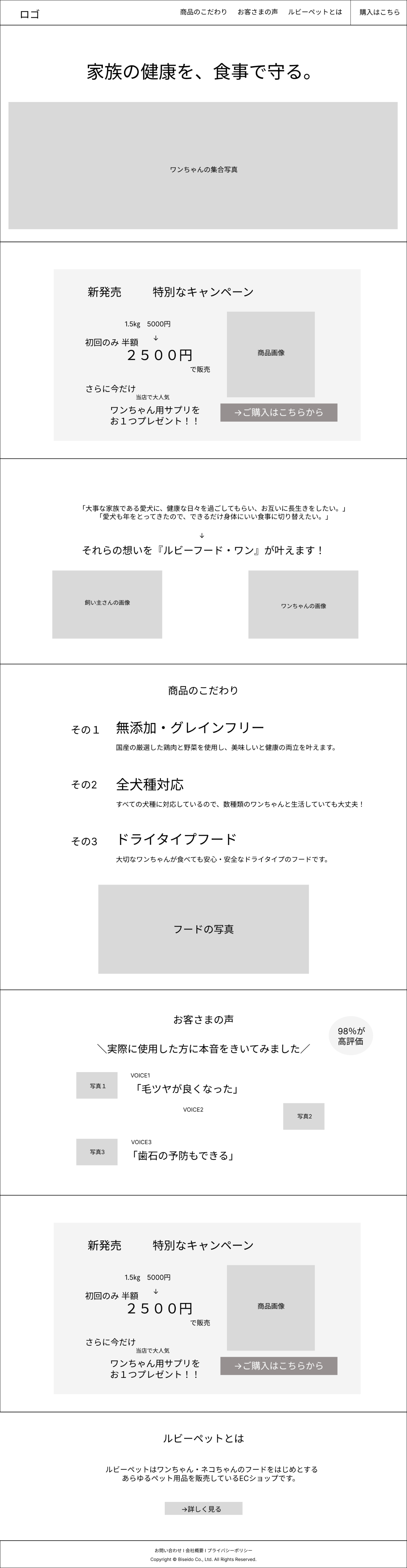 ルビーペットはワンちゃん・ネコちゃんのフードをはじめとするあらゆるペット用品を販売しているECショップです。 このたびワンちゃんの健康管理に特化したフード「ルビーフード・ワン」を販売するにあたりLPを公開します。 お試しフードの販売もするのでLP誘導とお試し購入誘導の目的でバナーを出したいと思っています。
