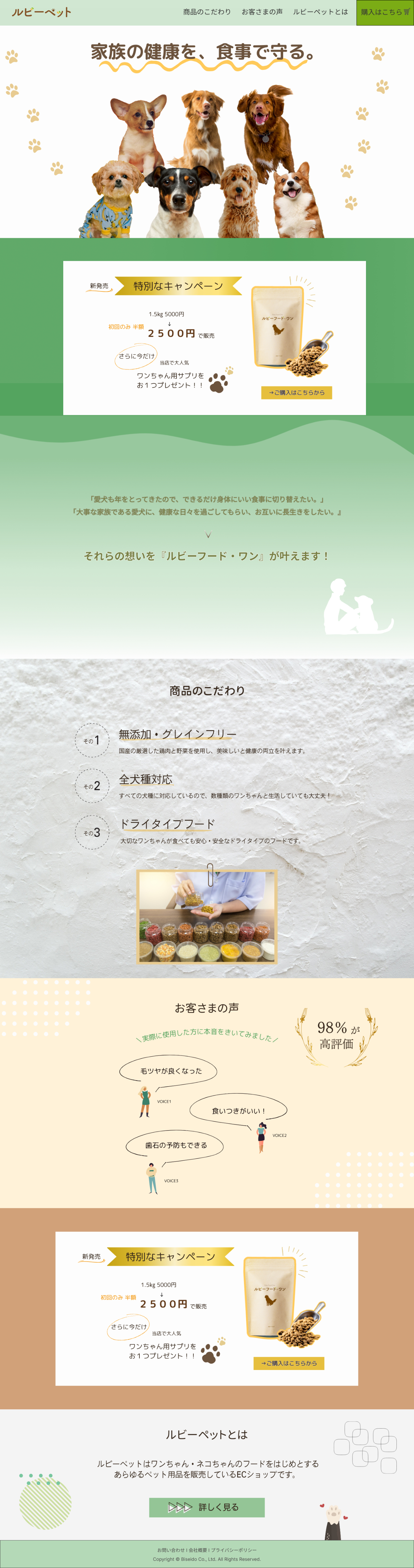犬の健康管理フードになるので、かわいい元気な印象のあるLPをお願いいたします。