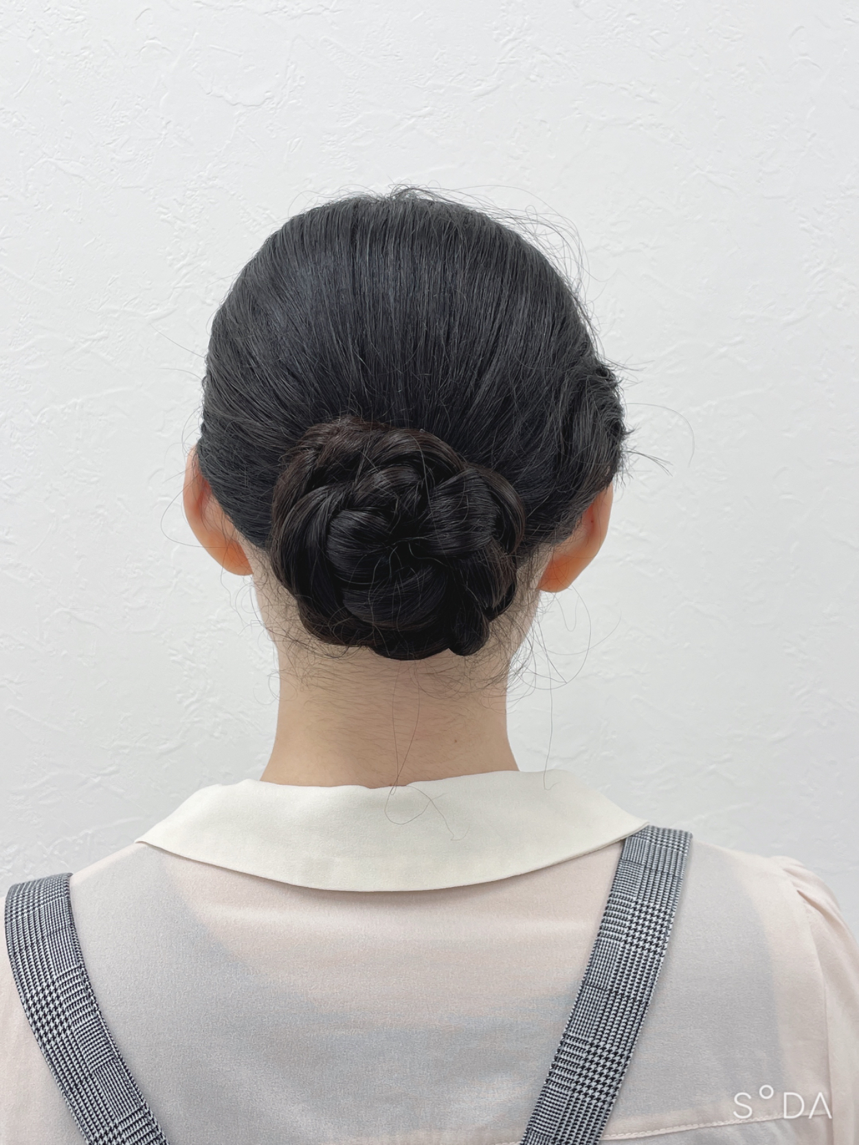 後ろは低い位置で三つ編みのシニヨンにしてまとめ、スッキリさせました。