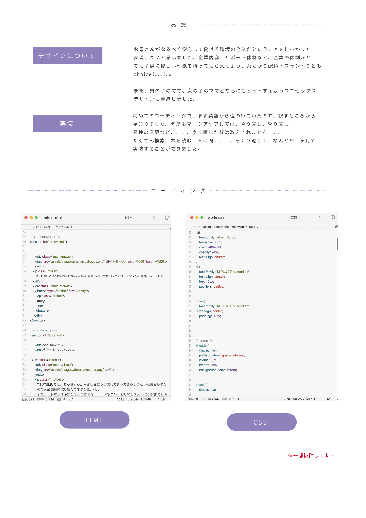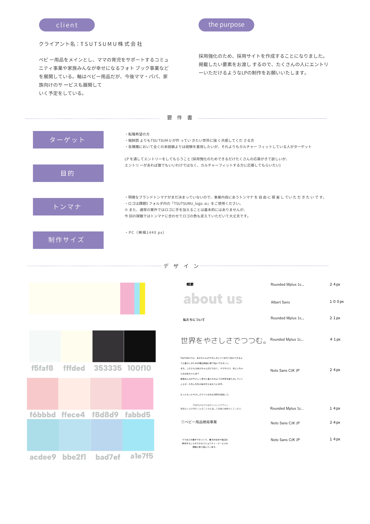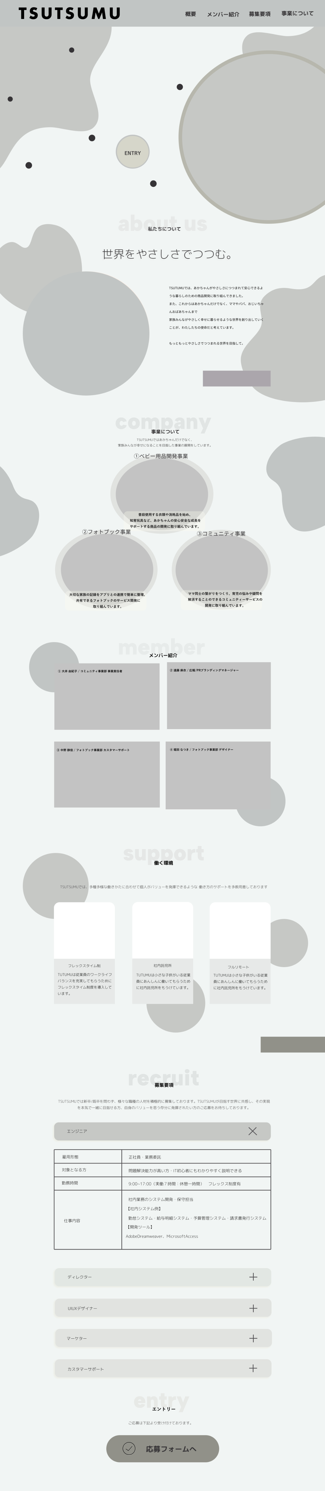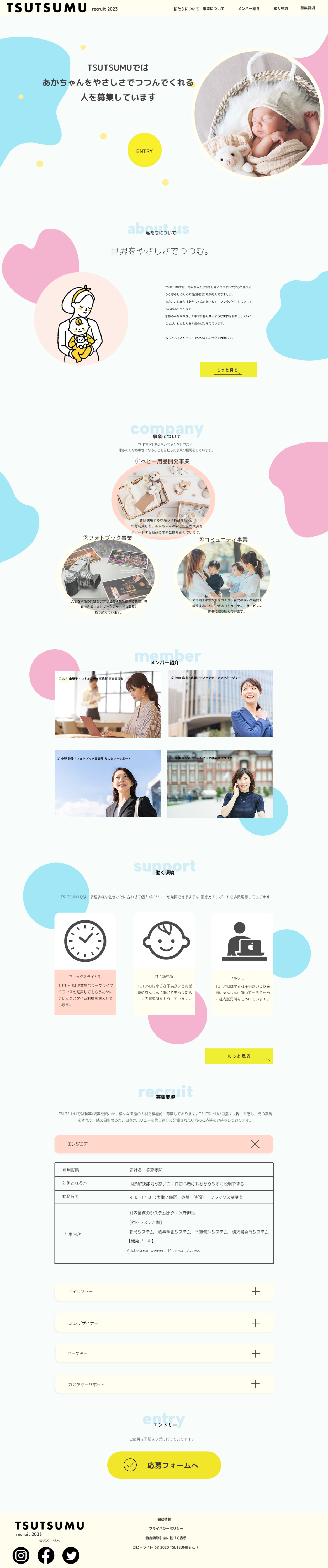 TSUTSUMU株式会社(ベビー用品などを扱う) 架空の会社の採用LPを制作。デザインからコーディング実装まで行いました。