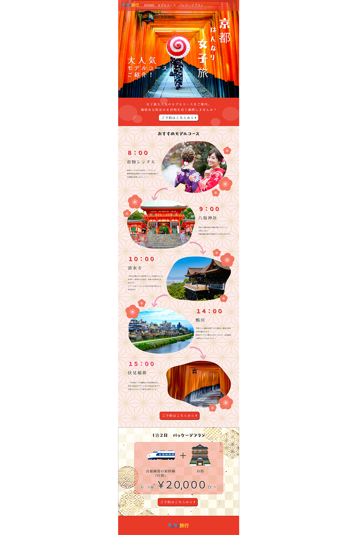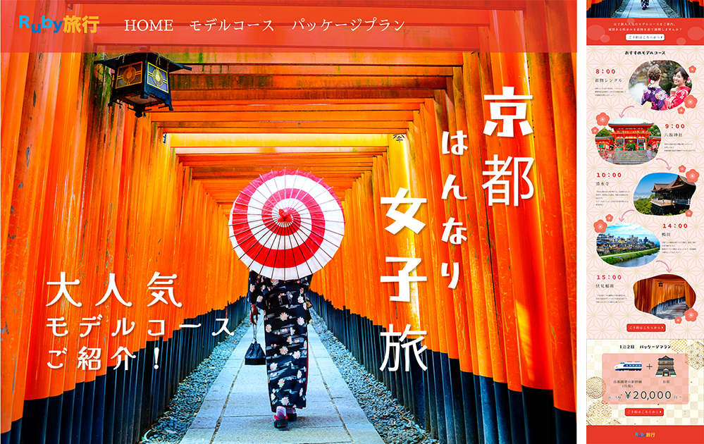 ・LPでは女性の方に楽しんでいただける京都旅行モデルコースを紹介し、パッケージプランの検索ページに誘導する流れで作成をお願いいたします。