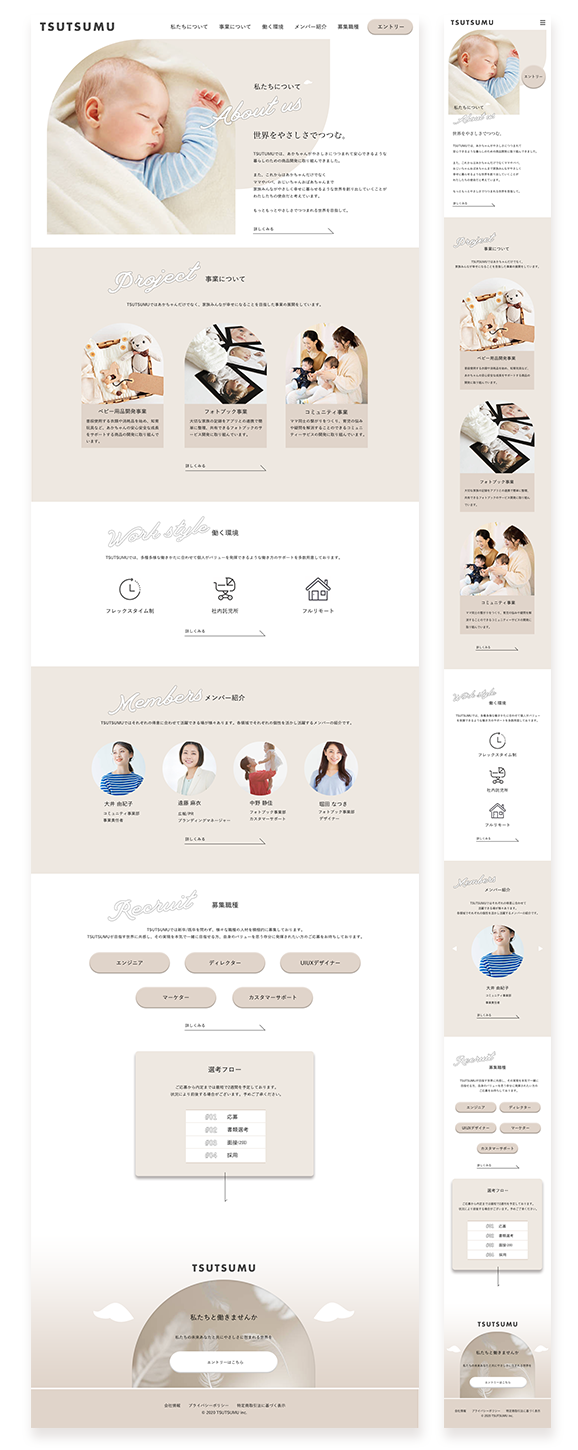 ・カルチャーフィットする方、TSUTSUMUがつくって行きたい世界に共感してくださる方に応募してもらいたいということなので、まずは会社自体の雰囲気をサイトで知ることが出来るよう意識して作りました。