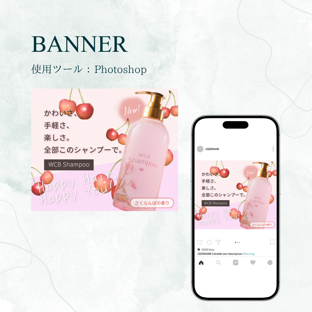 ・「Happy Hair, Happy You!」のコピーを手書きフォントにすることで、馴染みやすさを意識しました。