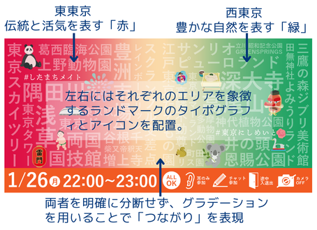 「東東京と西東京、ゆるくつながる」というテーマで制作。左右には、それぞれのエリアを象徴するランドマークをタイポグラフィとアイコンで配置。