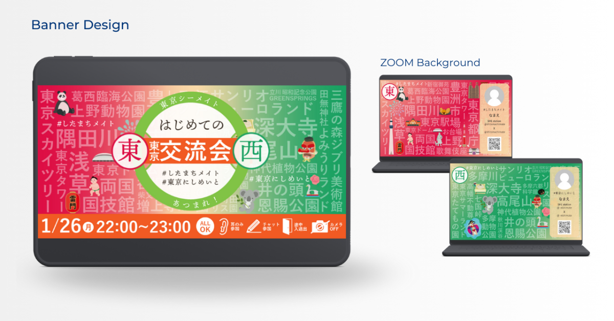 【実案件】シーメイト自主企画 「はじめての東西東京交流会」告知バナーとイベント用ZOOM背景