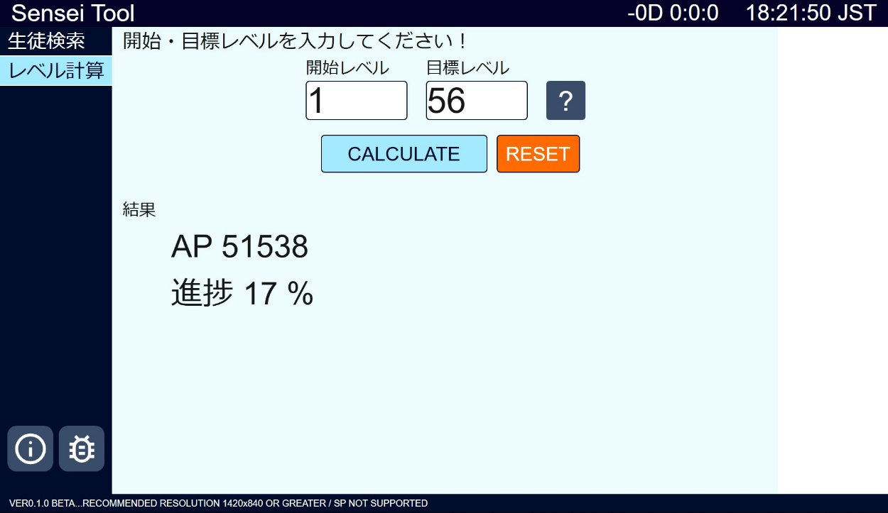 現在のレベル、目標にしたいレベルを入力することで必要な経験値を計算することができる。また、レベル1から目標レベルまで進んだ場合、最大レベルまでの全体の経験値の中でどこまで進行したかを確認することができる。