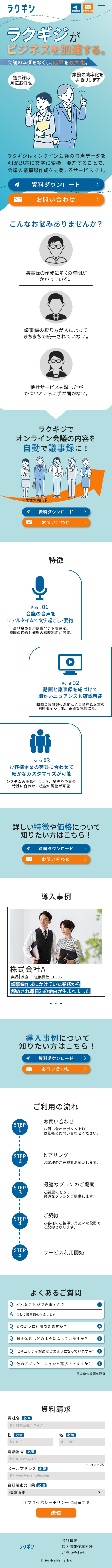 オンライン会議の音声を元にして、AIが会話内容を文字起こし・要約し、議事録を自動で作成してくれる架空サービス「ラクギジ」。