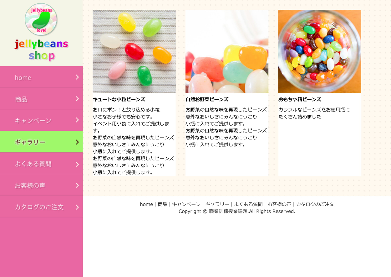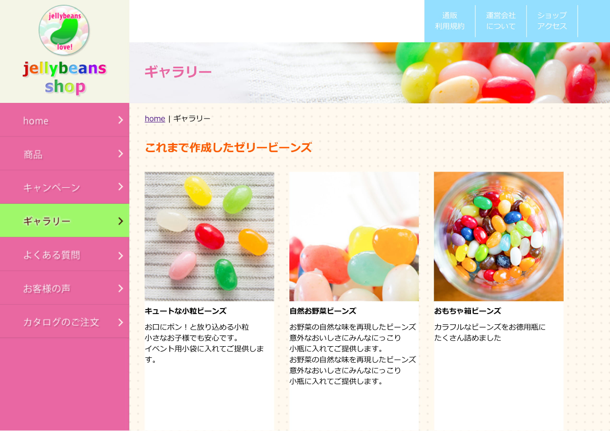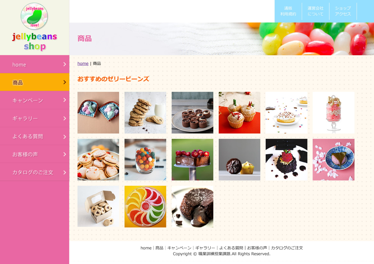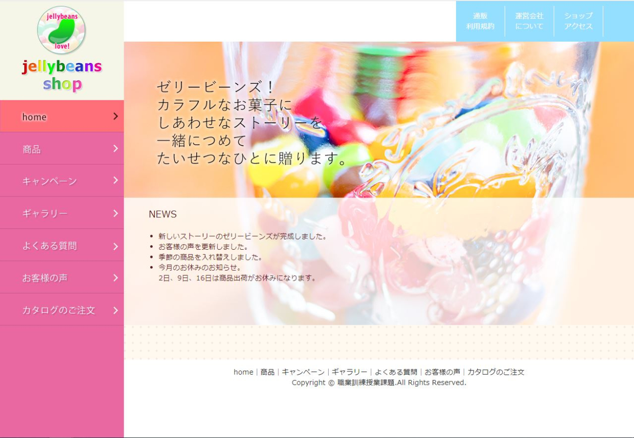 仮お菓子販売店舗サイト制作 安藤愛里 Webコーダーを目指すもの OVERVIEW 職業訓練校で学んだことを元に、ジェリービーンズのお店に必要な機能を兼ね備えているサイト制作を行いました。 YEAR 2019