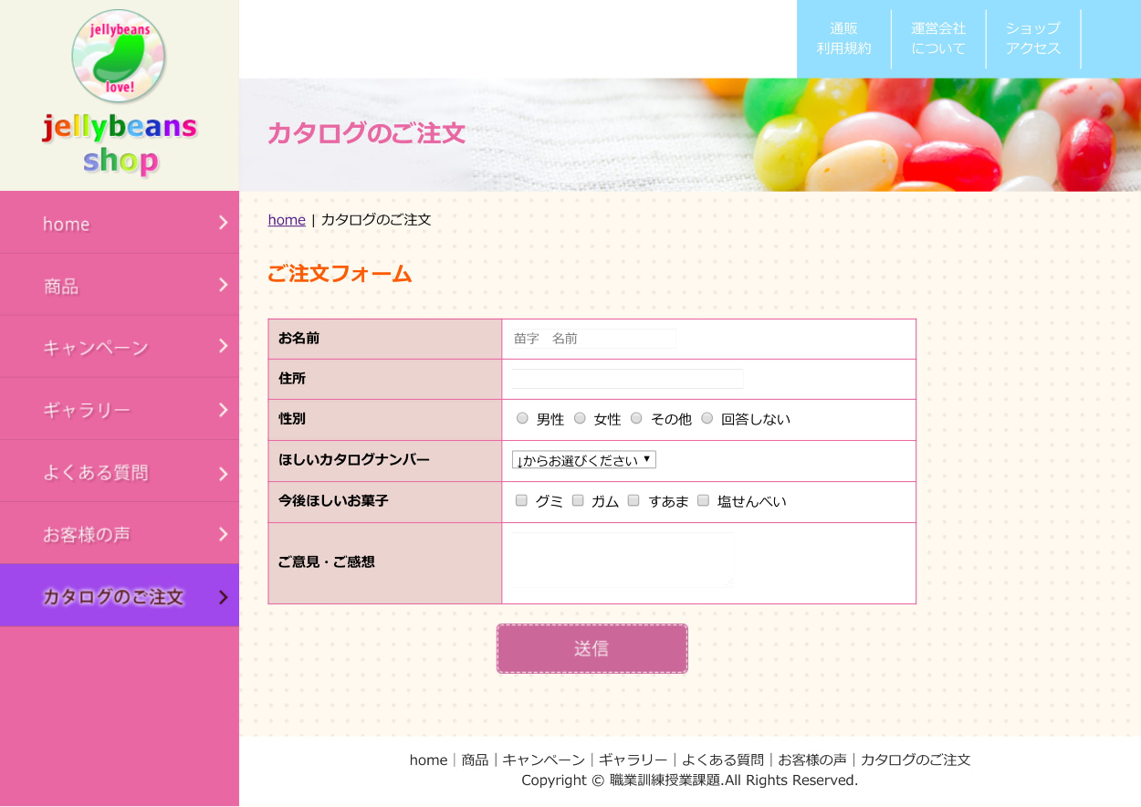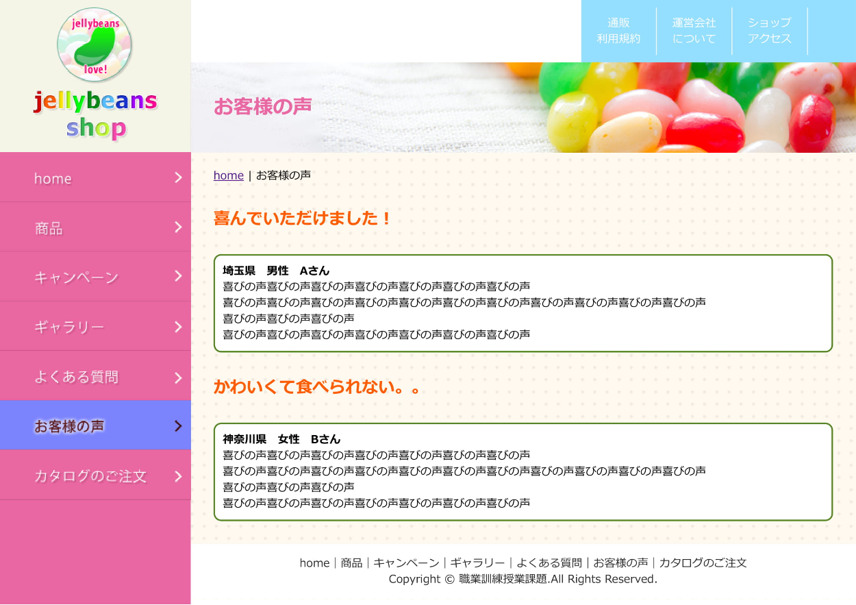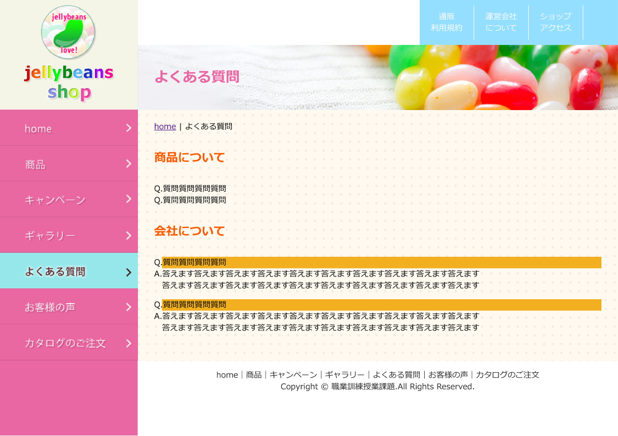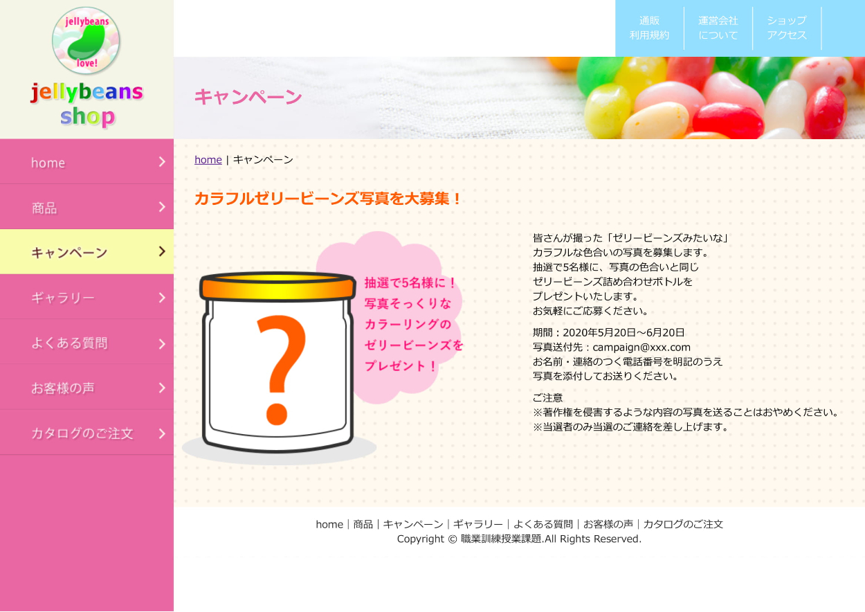 仮お菓子販売店舗サイト制作 安藤愛里 Webコーダーを目指すもの OVERVIEW 職業訓練校で学んだことを元に、ジェリービーンズのお店に必要な機能を兼ね備えているサイト制作を行いました。 YEAR 2019