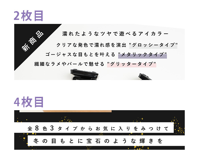 ・【2枚目】テキストのラインに使う色は商品から抽出し、全体のまとまりを表現した。