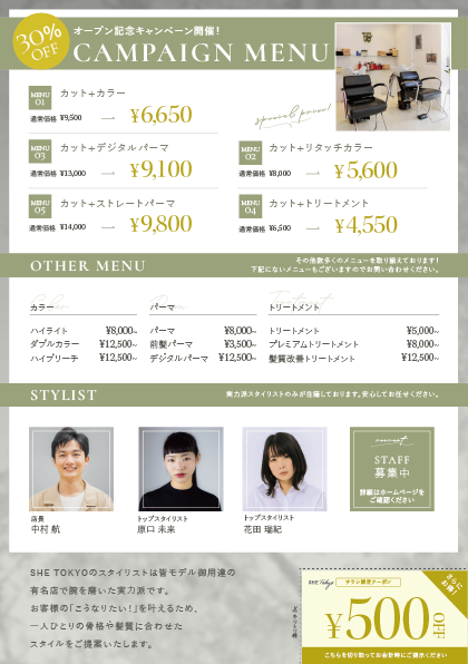 美容室のオープンに合わせて特別キャンペーンを実施しようと思っており、ポスティング用のフライヤーを制作してほしい。 - クライアント情報