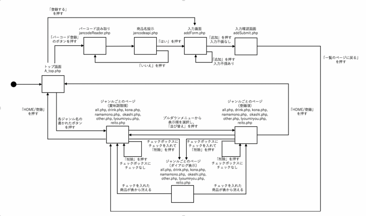 本システムは, 食品の賞味期限を登録することで, ウェブ上で管理することができるシステムである. ターゲットとする利用者は主婦・主夫や一人暮らしをしている人などの普段から料理をする人であり, 料理をしようとした時にどの食品の賞味期限がきれているのかをまとめて把握することができる. 食品の登録方法として, テキストでの入力の他に, JANコードを読み取ることで自動的に食品名が入力されるようにした.