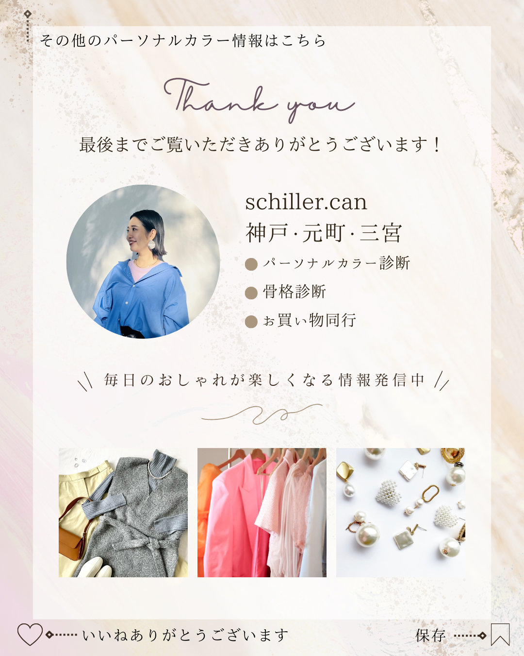 パーソナルカラーサロン【schiller.can】藤本なつみ様のInstagramに投稿するSNSバナーの作成を行いました。 《それぞれの骨格に本当に似合うファッションアイテム》をテーマに、アイテム画像を厳選し、お洋服のブランド、着こなし方等の説明文を記載したバナーを作成。