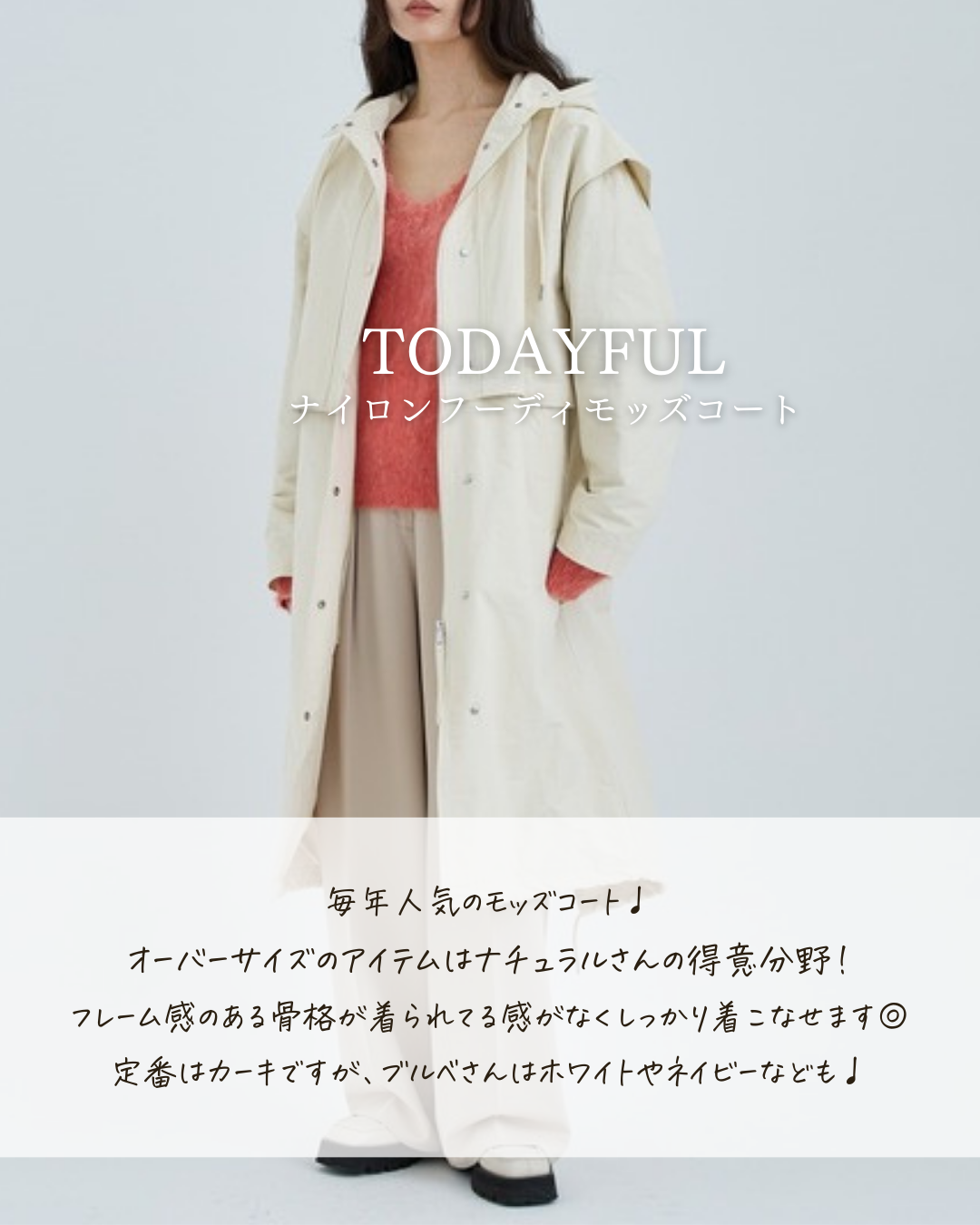 →画像の下半分にはファッションアイテムの特徴、魅力、着こなし方等の詳細を掲載 【詳細の様な中文は文字だけでの記載では読みにくい為、半透明の白枠を文字の後ろに置くことで、読み易く且つシンプルになりすぎない画像のデザインに仕上げます】