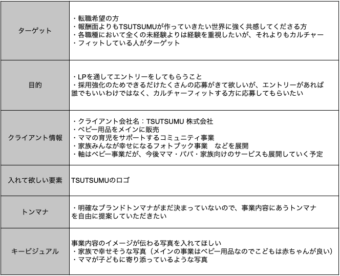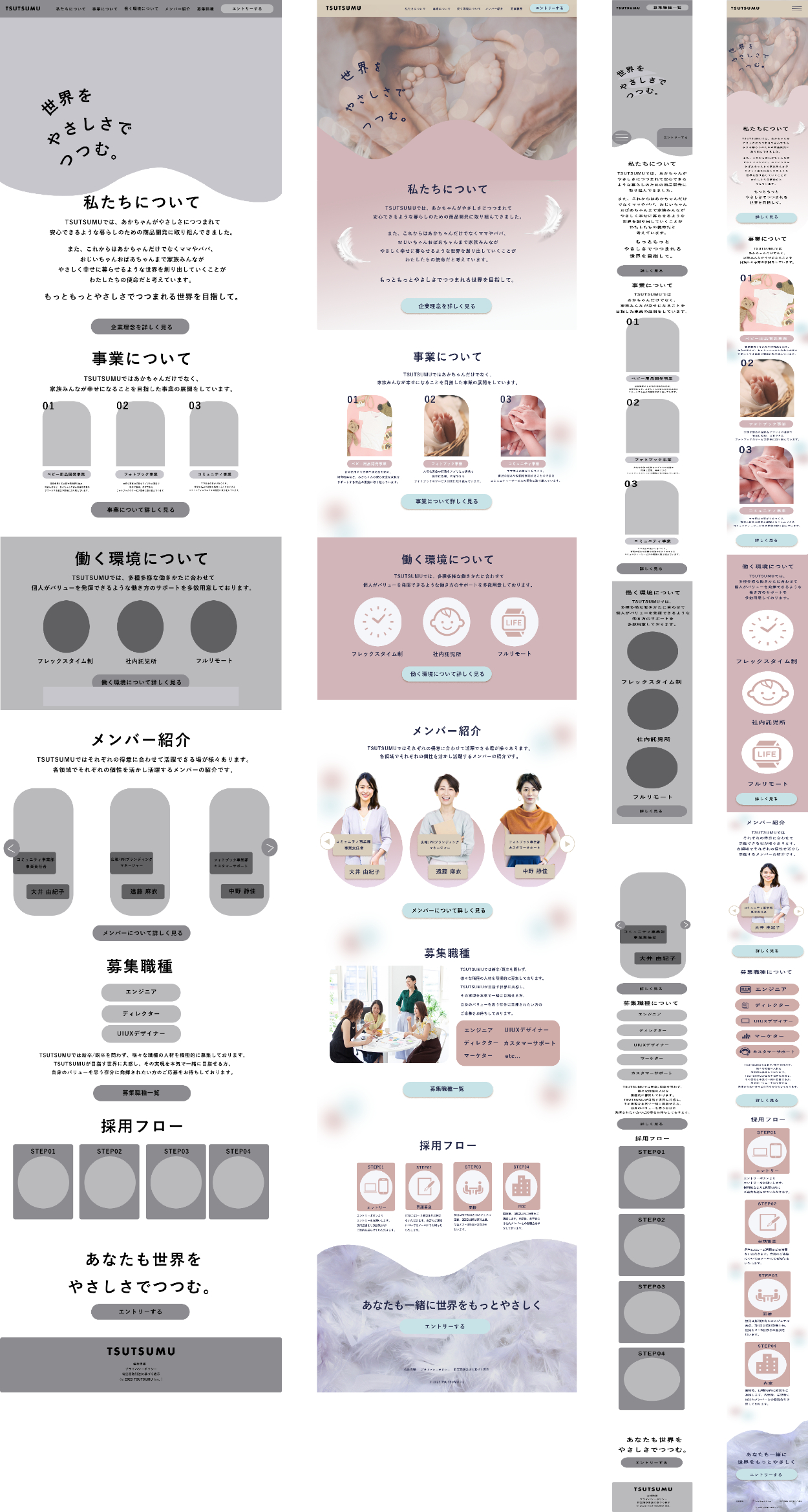 ブランド名がTSUTSUMUという名前だったので言葉から想起される「包み込む」イメージをLPで表現できるようにしたいなと思い制作しました。また、様々な家族の形を描けるサービスになっていると感じたので、そのきっかけを作ることができるシーンを届けるのが目的として20−30代のご夫婦もしくはファミリー層向けに展開できるといいなと思い作成しました。