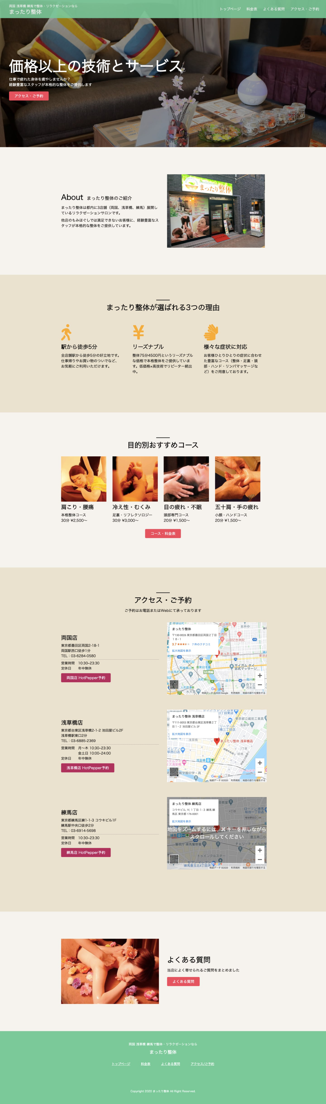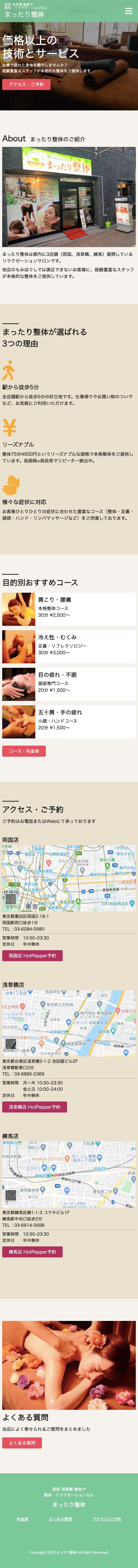 「多くある整体院の中でも、高い技術力とコスパの高さをアピールしたい」というご要望から制作。店舗ロゴの配色を参考にデザインしています。また、中国整体の入店しにくさを解消するためにFAQを充実させました。