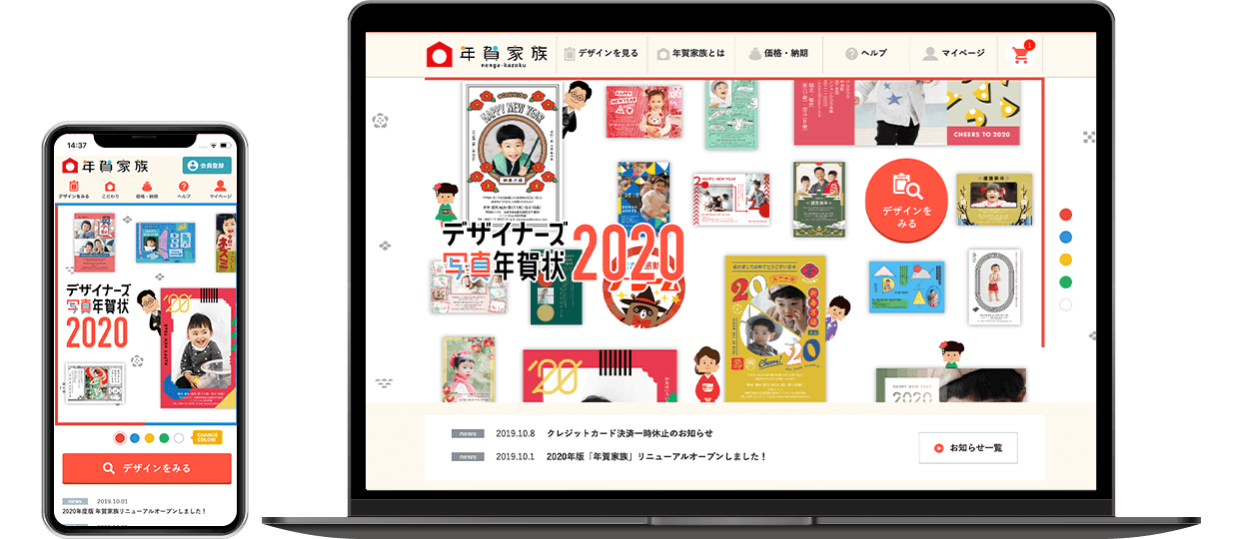 サイトデザインはトレンドを意識したシンプル路線ではなく、毎年訪れてくださるお客さまが「今年の年賀家族はどうなっているかな?」とワクワクするようなPOPで遊び心のあるリニューアルを重ねてきました。
