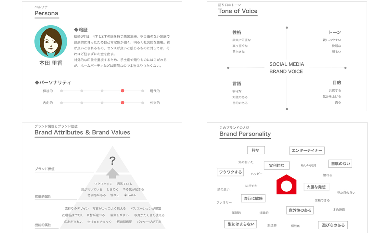 ユーザーから得られた情報とサービスのコンセプトを結合させたブランディングシートを作成。サービスの提供価値を定義し、トーンマナーの基礎となるコンセプトメイキングを行った。