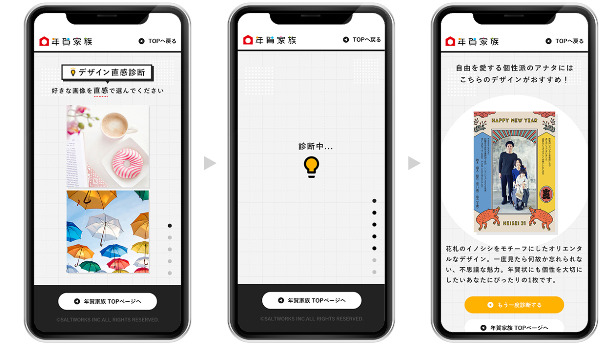 好みの画像を5つ選ぶだけで、おすすめのデザインが表示される『デザイン直感診断』。遊びのあるコンテンツを追加することで、大量のデザインを前に離脱するユーザーの引き込みを狙った。