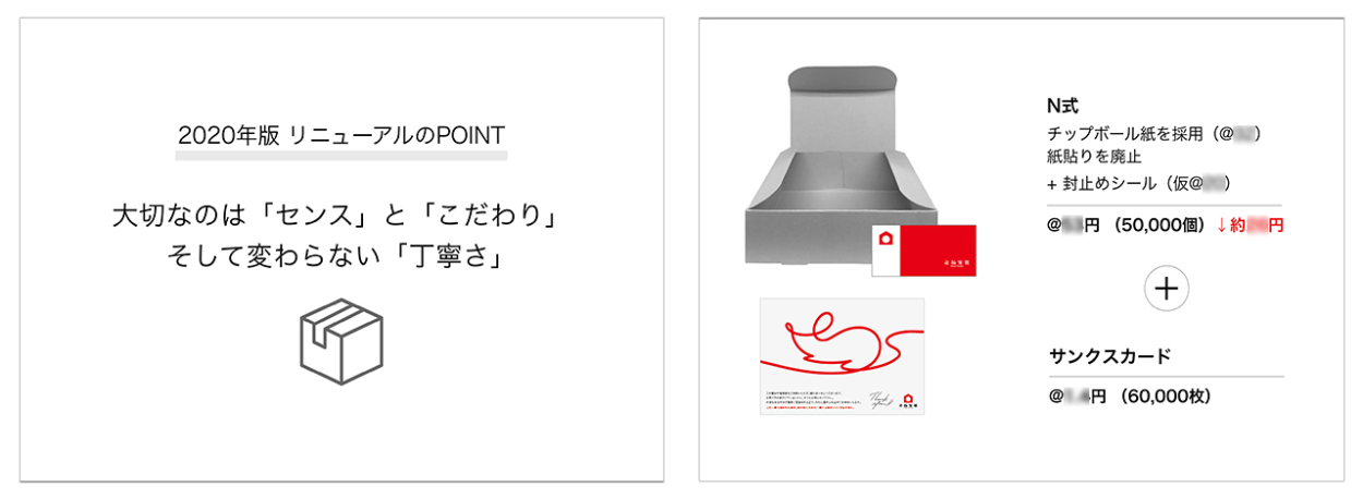 紙の価格高騰に起因し、パッケージのリニューアルを行った。原価を抑制しながら「丁寧さ」が感じられる仕様を模索。安価なパッケージでリピーターさまの心象を損なうことのないよう、封止めシールを採用。開封時のサンクスカードと繋がりを持たせることを意識した。
