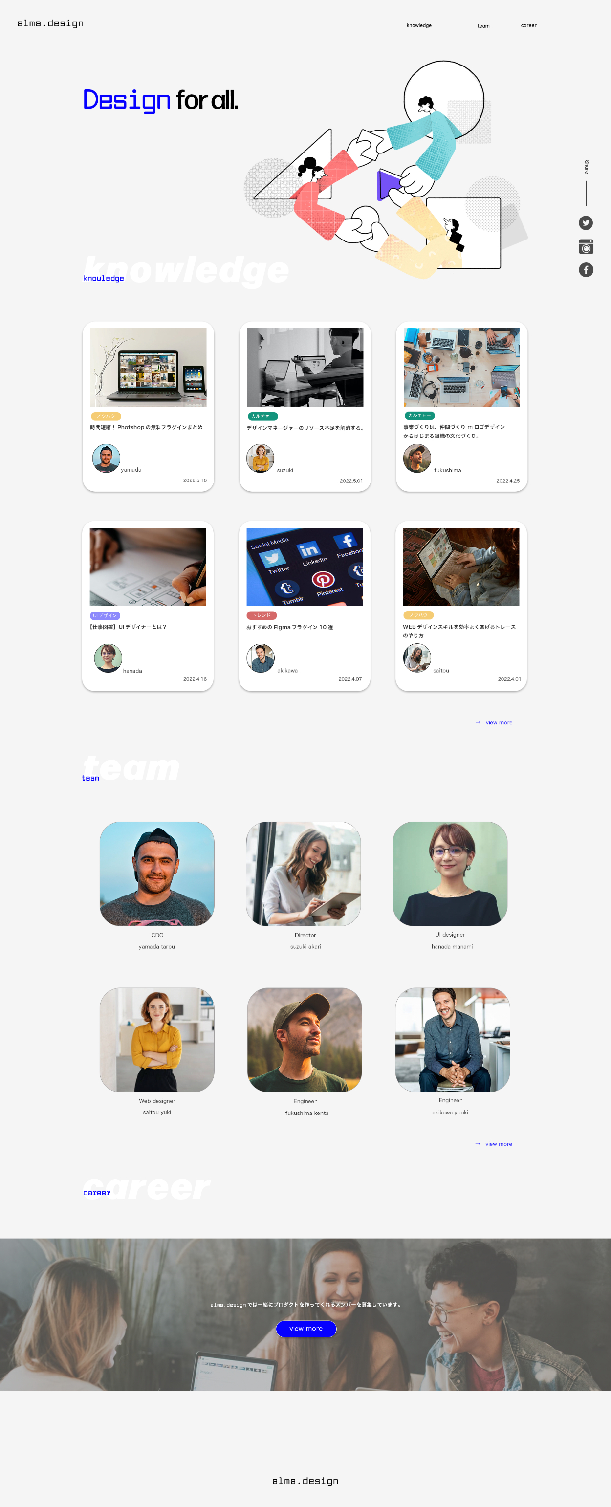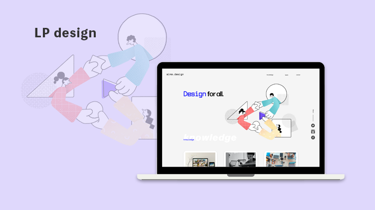 コンセプトメッセージ「Design for all」や会社名「alma.design」のフォントで少し遊びを効かせたり、イラストを使用することでシンプルの中にもデザイン性を感じるような工夫しました。