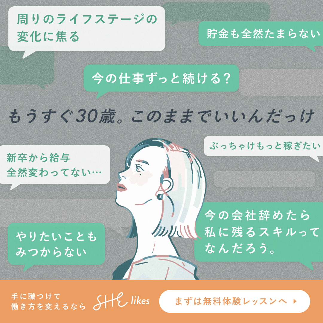 SHE株式会社様が運営する女性向けキャリアスクール「SHElikes」体験レッスンへの誘導を目的としたSNS広告バナーを制作しました。 使用ツール:Figma/制作時期:2024年5月
