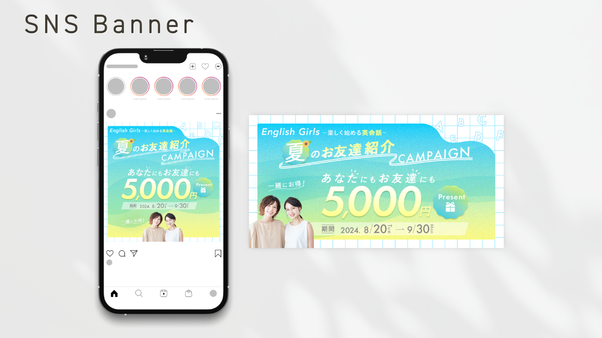SHElikes PRO デザイナーコースの実践課題として、英会話スクールのキャンペーンバナーを制作しました。クライアント様から共有された要件をもとに、X(旧Twitter)とInstagramのバナーを制作しました。使用ツール:Photoshop / 制作時間:15時間