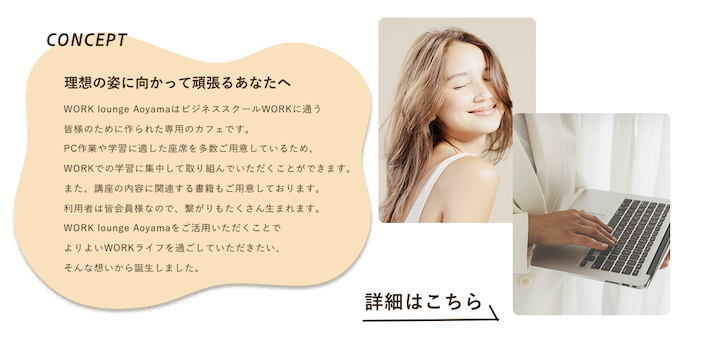 メインとなるコワーキングスペースの写真にはコンセプトに合うよう開放感、洗練されたイメージの湧く写真を選定しました。ゆったりと自分の時間をくつろいで、多くの人と交流できそうなイメージになる写真を意識しました。