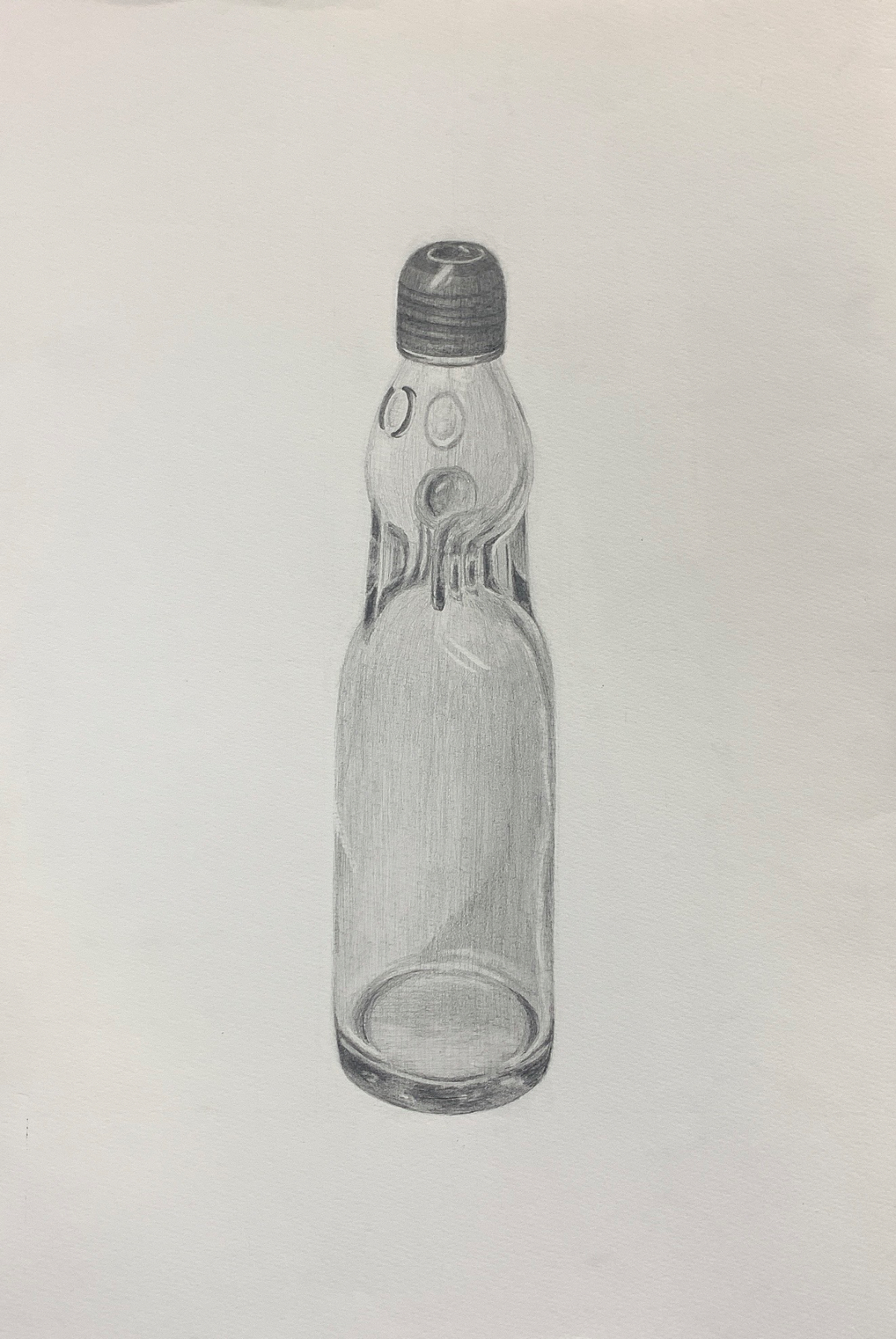 デッサン/ラムネ瓶 Mai Takaoka 光と影の関係を丁寧に観察して描きました。ガラス特有の硬さや透明感、内部の複雑な反射を表現することで、形の確かさと空間の奥行きを意識しています。使用ツール:鉛筆