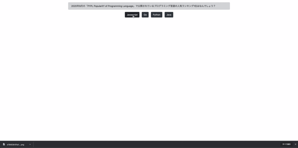 プログラミングを題材に計5問、回答をクリックすると「正解/不正解」のアラートが発生し、全問終了すると結果が表示されます。