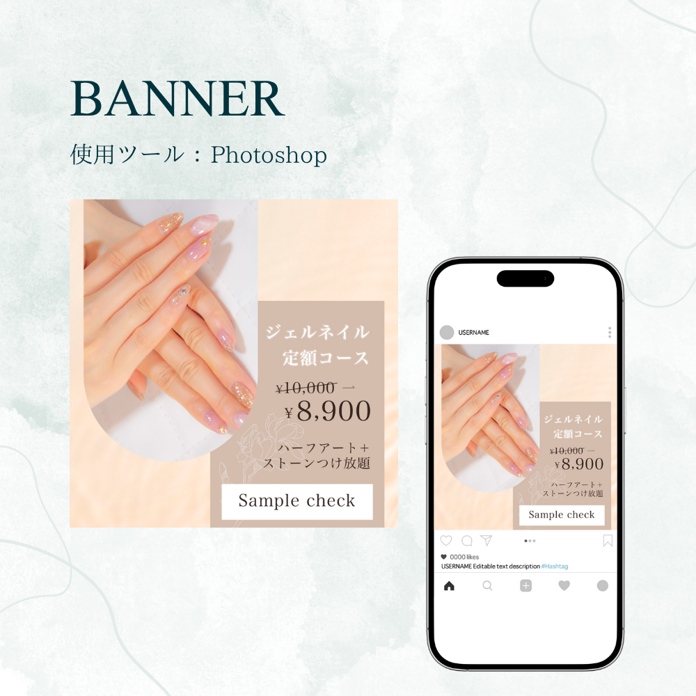 ・写真と文章の2分割でデザインしました。ネイルの写真を見る→興味を持つ→定額キャンペーンに興味を持ってもらう流れを意識しました。