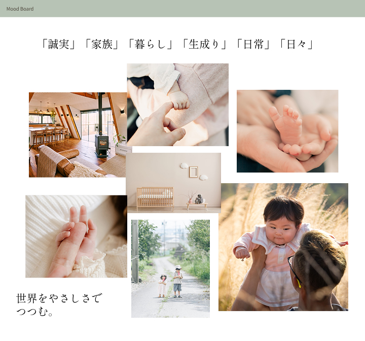 作り込まれた理想像ではなく、実際の生活の延長にあるありのままの子育ての風景を切り取ることで、性別を問わず自然に育児に関わる姿を表現し、企業の誠実さと信頼感が伝わる世界観を設計した。
