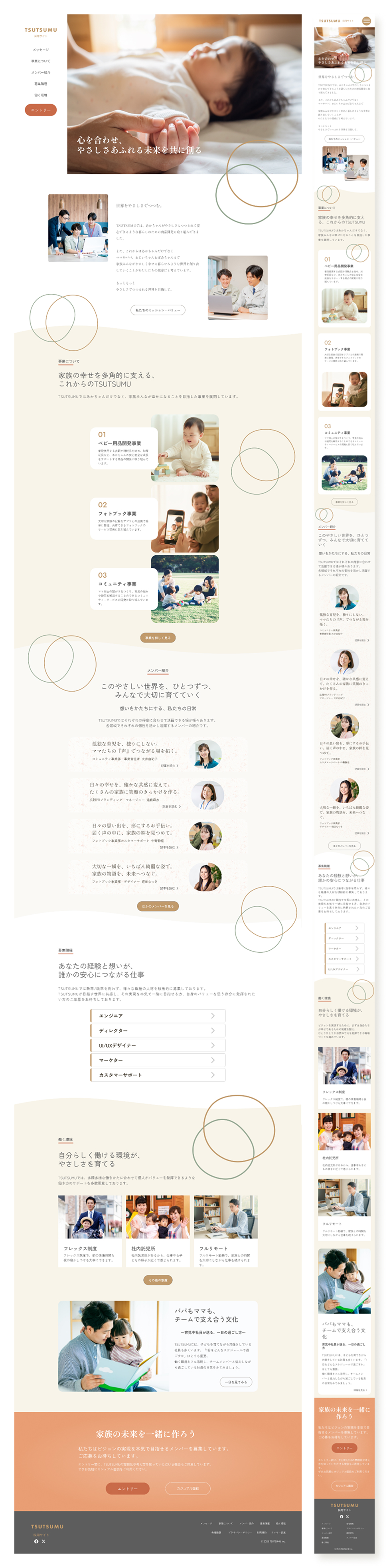 TSUTSUMUが掲げるテーマから、特に今回「男性も当たり前に育児を担う社会」にフォーカスしました。それを体現するため、従来のベビー用品サイトにみられる甘い表現を抑え、「誠実さ」と「意志の強さ」を軸にデザインした。性別役割の固定観念を払拭し、男性も主体的に関われるよう信頼感のあるビジュアルを採用。大人の背中を子どもが見て育つ、家族全員の幸福を包み込む企業姿勢を、誰でも迷わず使えて情報が整理された画面設計で表現した。