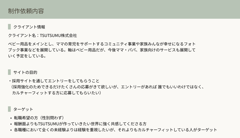 ・採用サイトであることと、ママ向け事業=オレンジやピンクの暖色という固定観念を排し、性別を問わず自分事として捉えられる印象を目指した 。