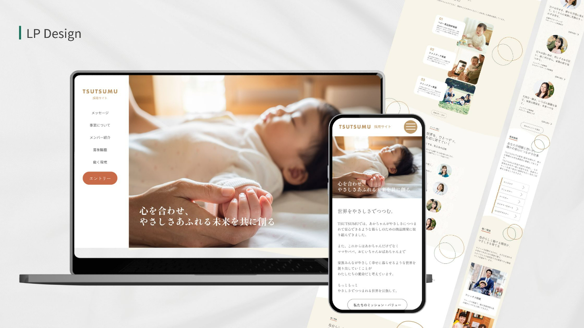 ターゲットに対してTSUTSUMUが掲げる「世界をやさしさでつつむ」というビジョンが直感的に伝わる世界観を構築した。